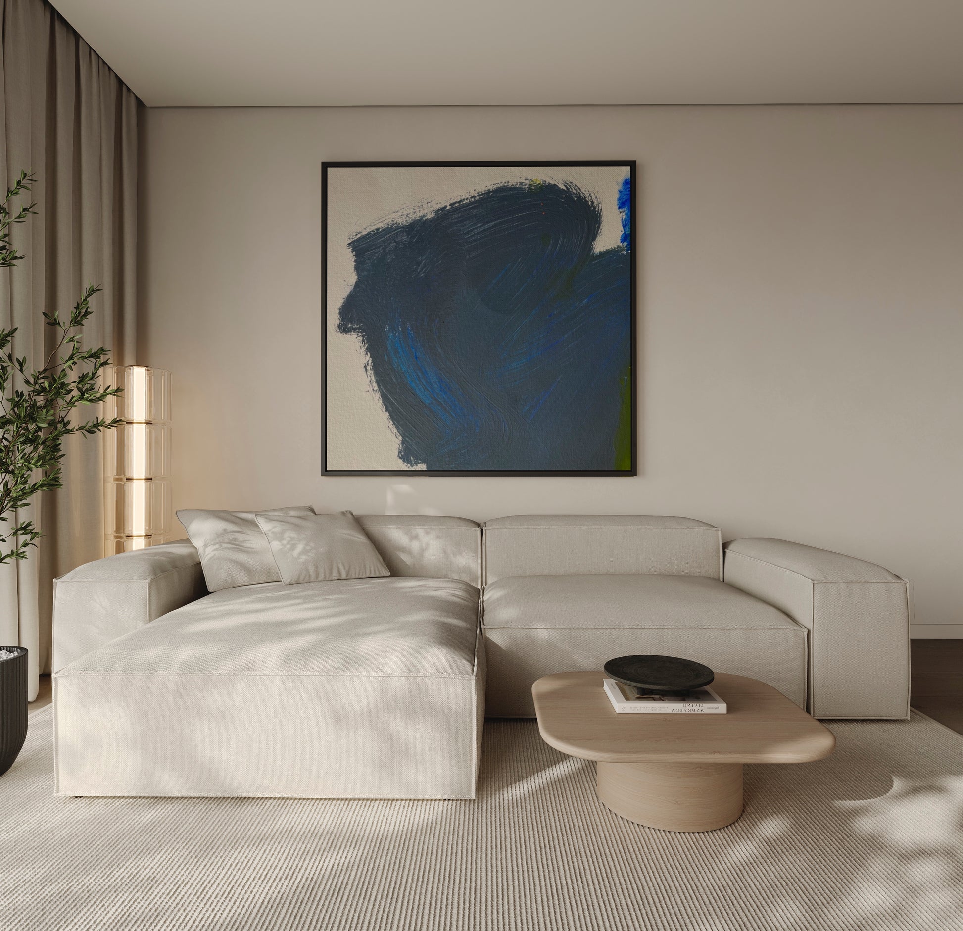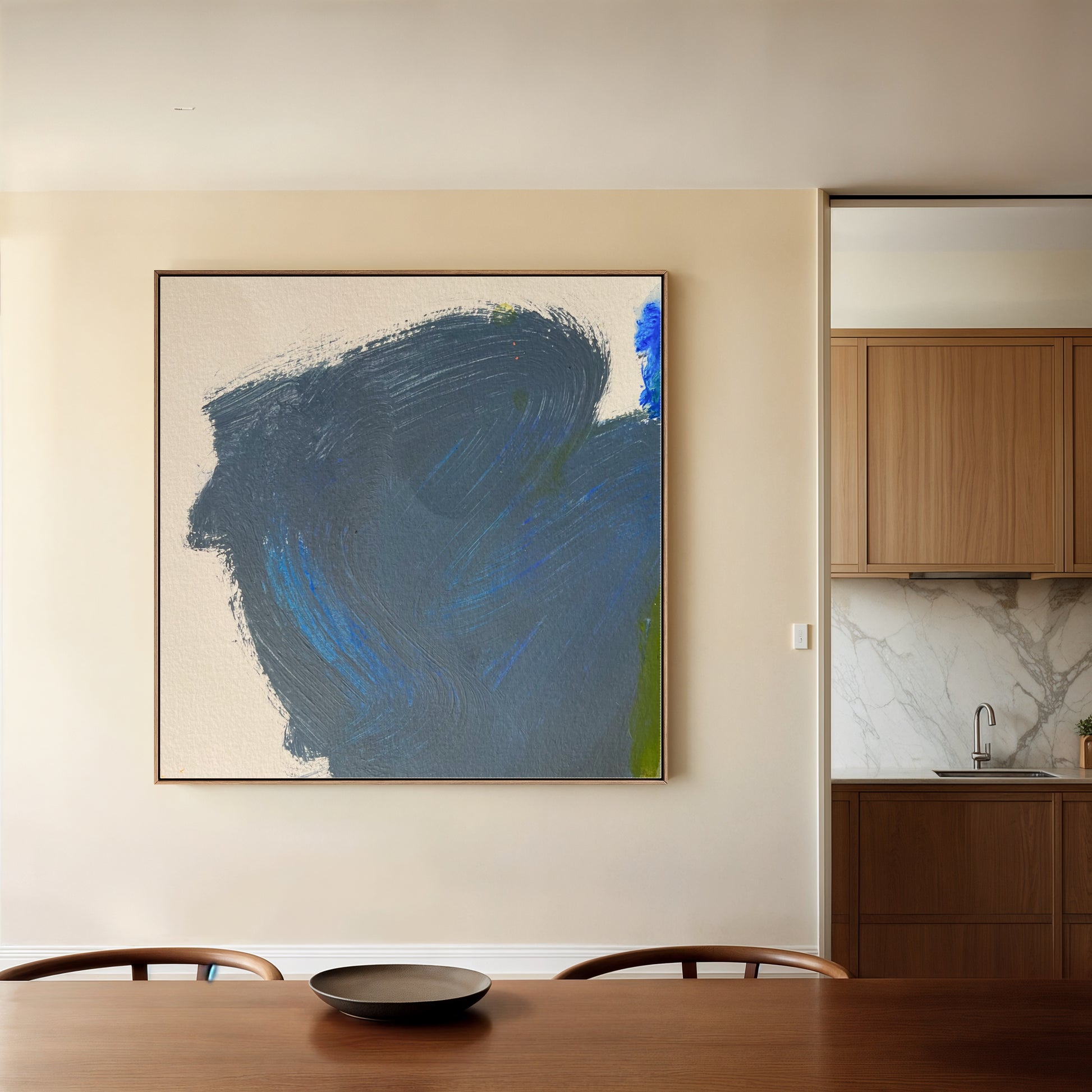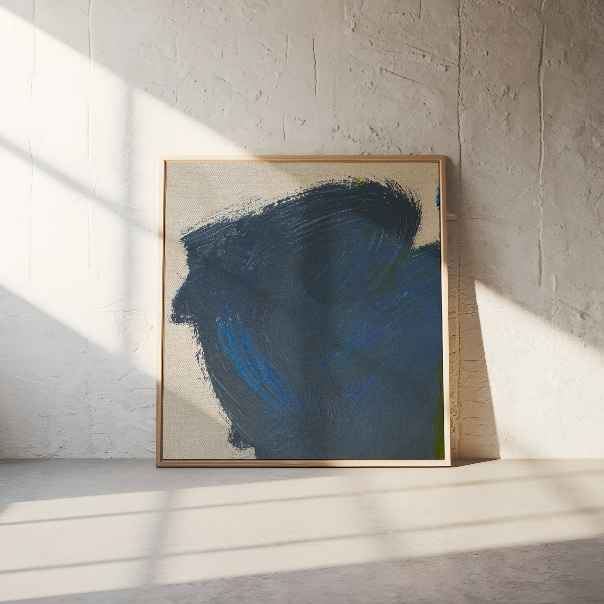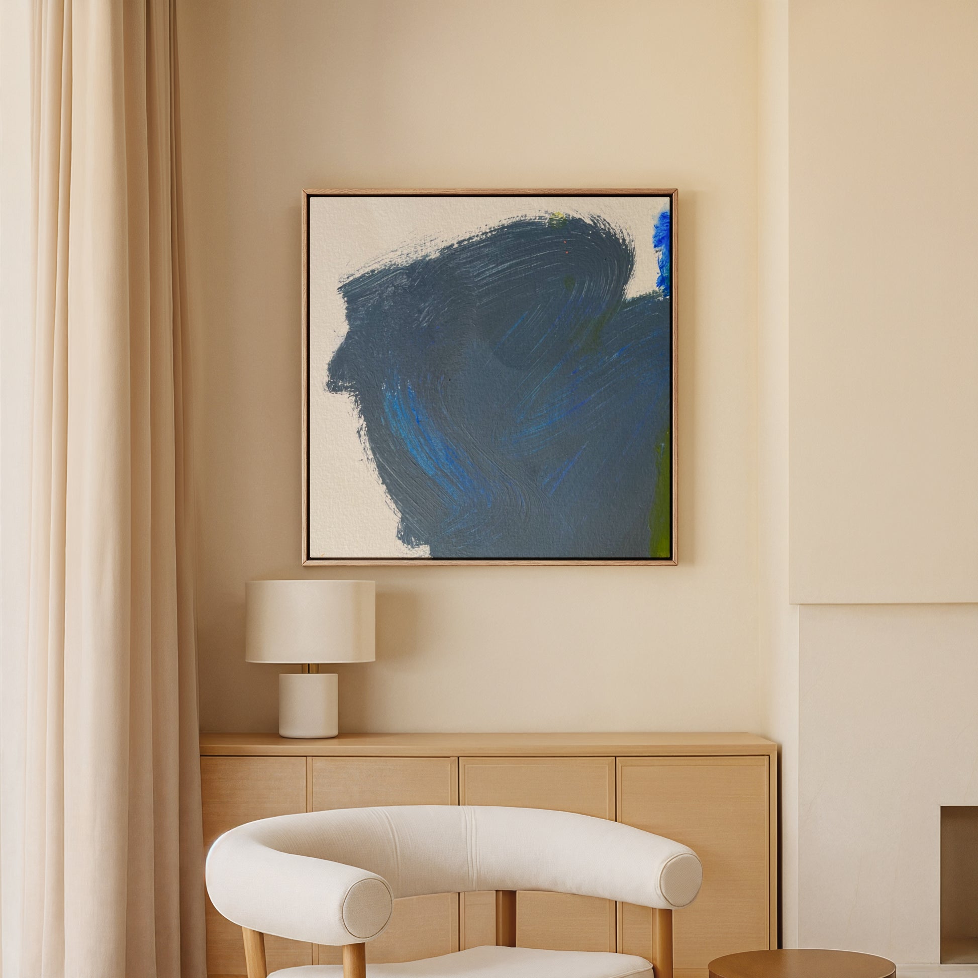 Minimal and meditative, Blue Silence brings a sense of calm strength to any environment. Deep indigo and soft cobalt strokes create the impression of quiet motion—like a thought taking form, or a wave stilled mid-rise. Its simplicity makes it versatile, perfect for modern spaces seeking balance, focus, and depth. The piece invites pause and breath, infusing a room with stillness that feels both grounded and expansive.