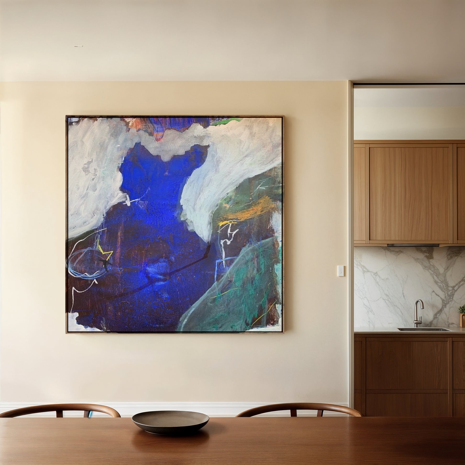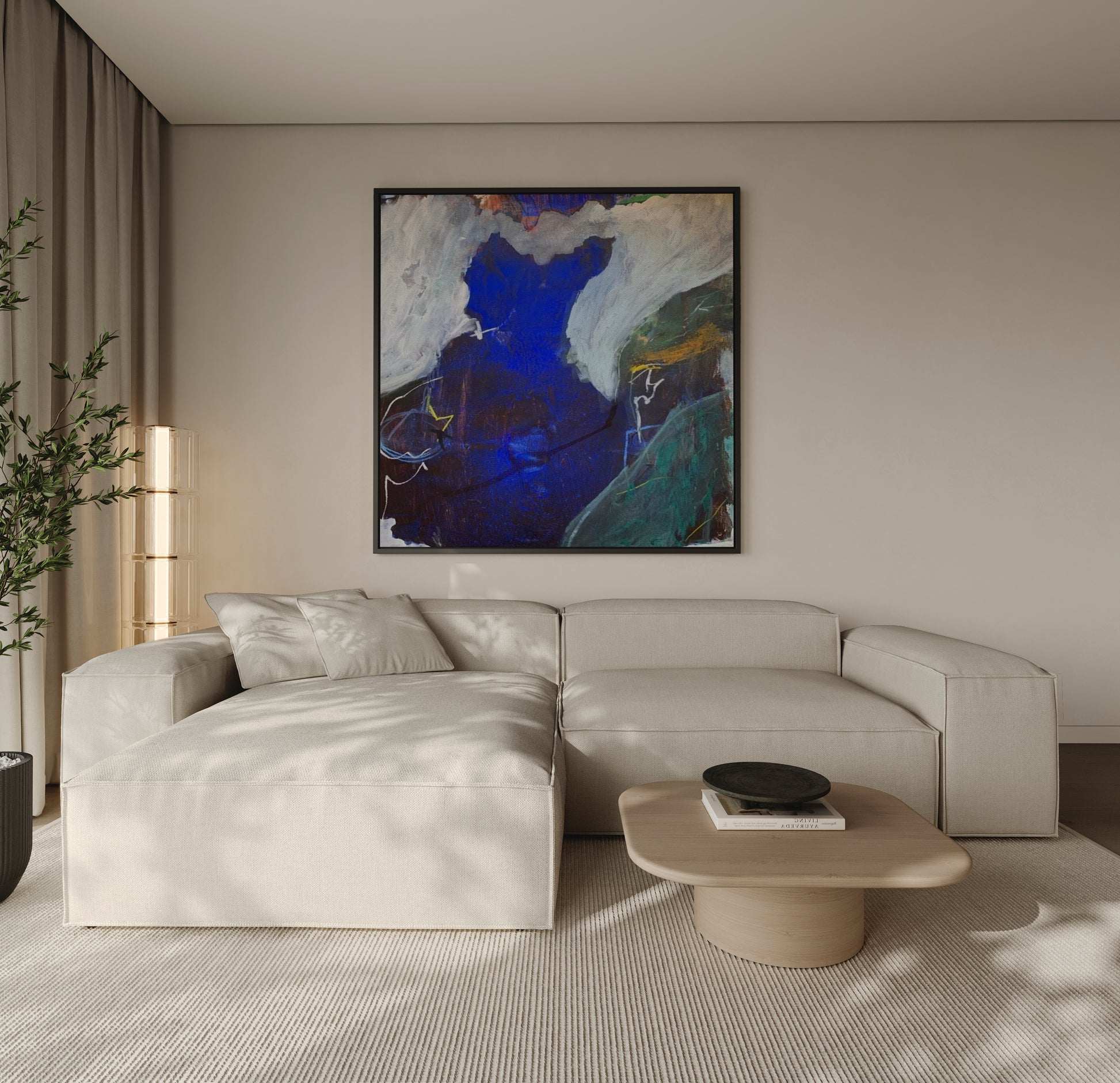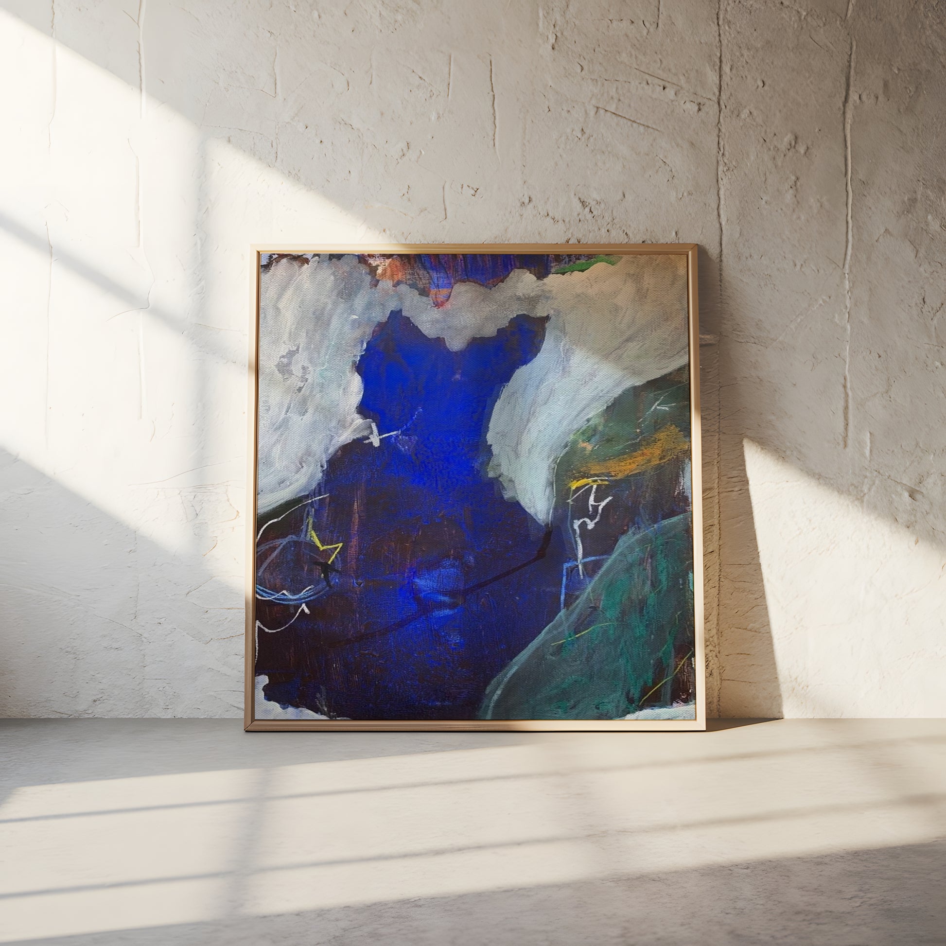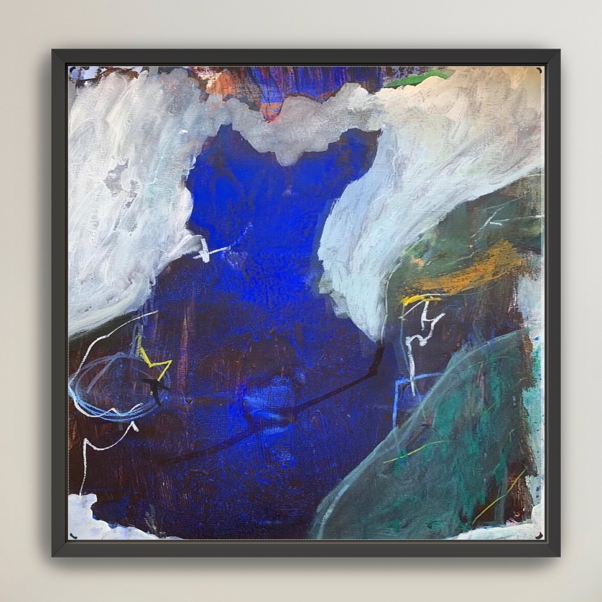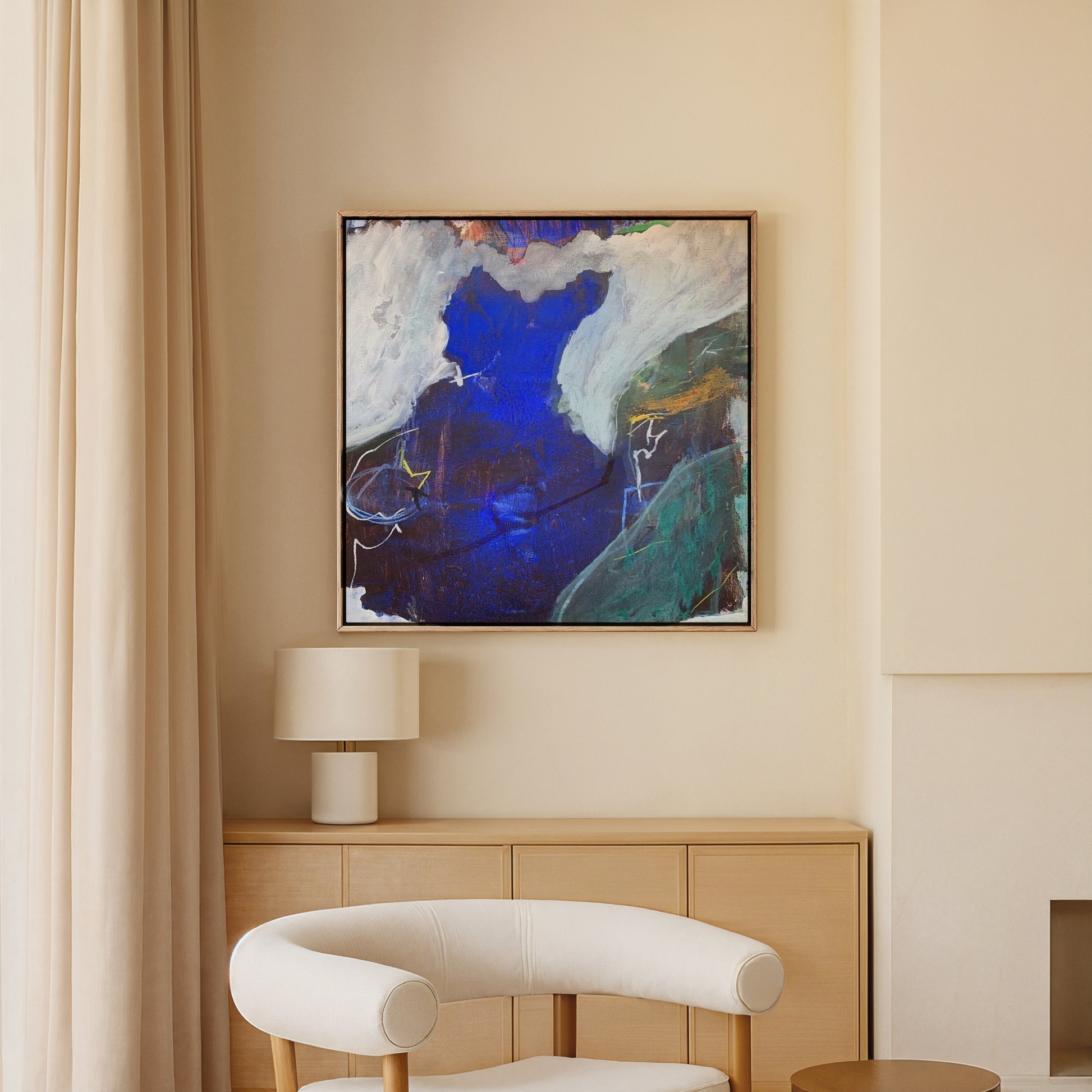 This piece is printed on a thick, archival-grade polycotton canvas, hand-stretched over solid wood stretcher bars and finished in a wood floater frame.