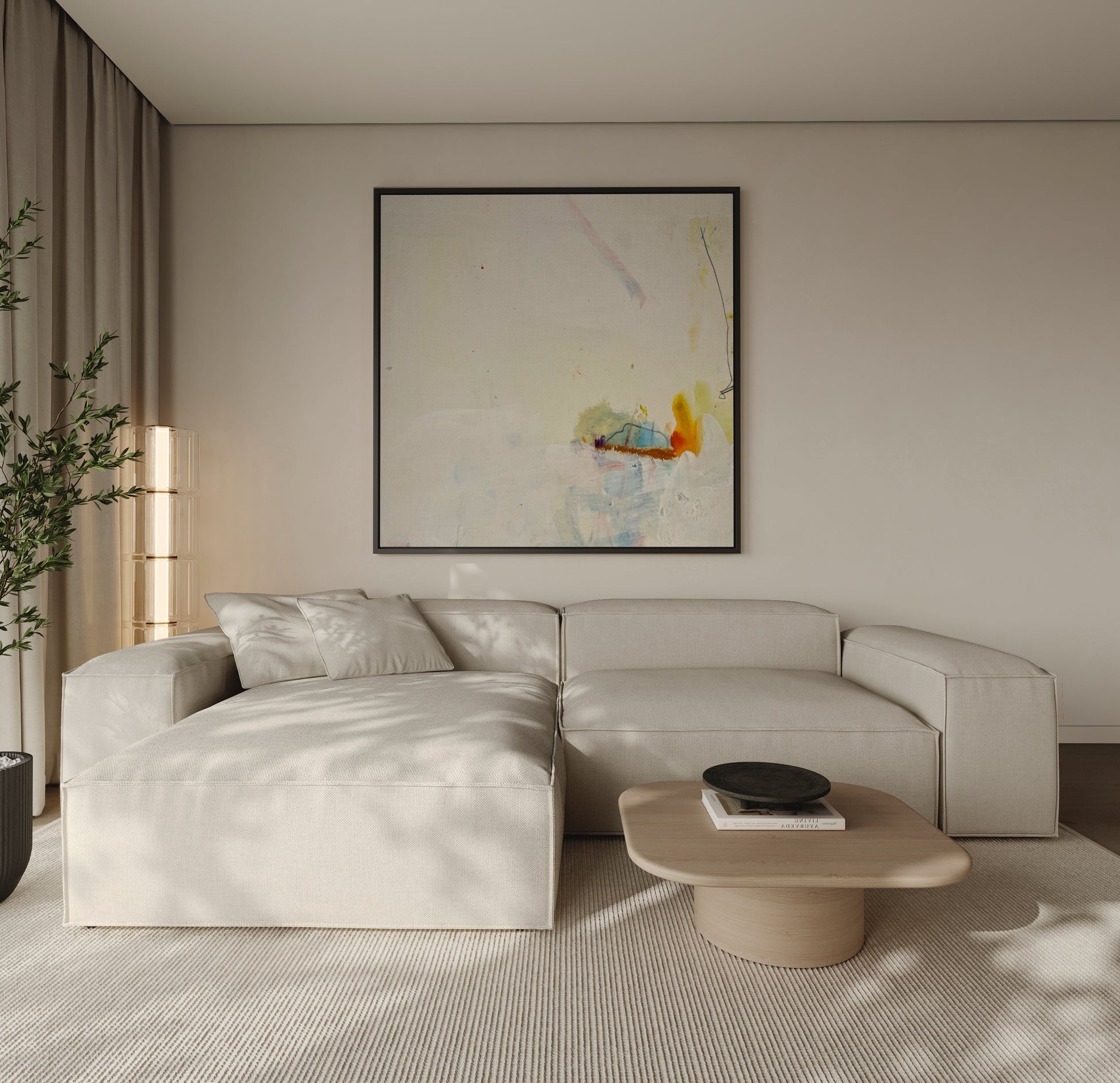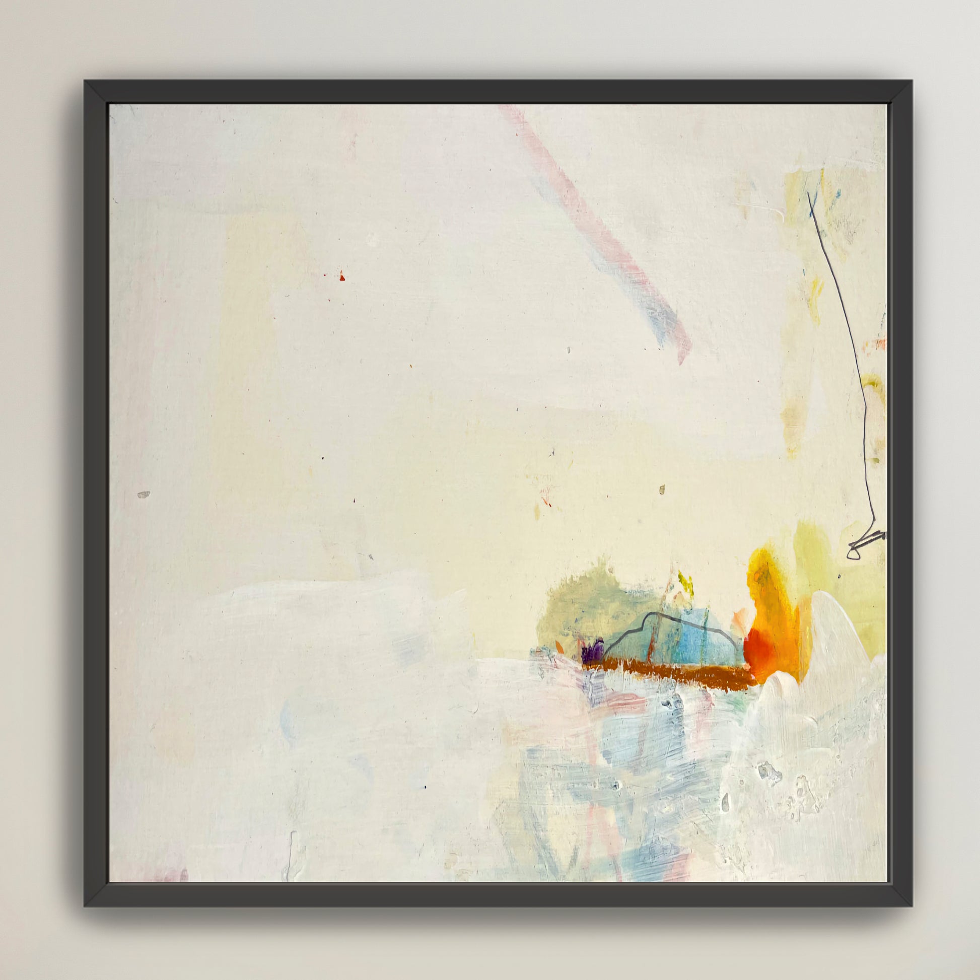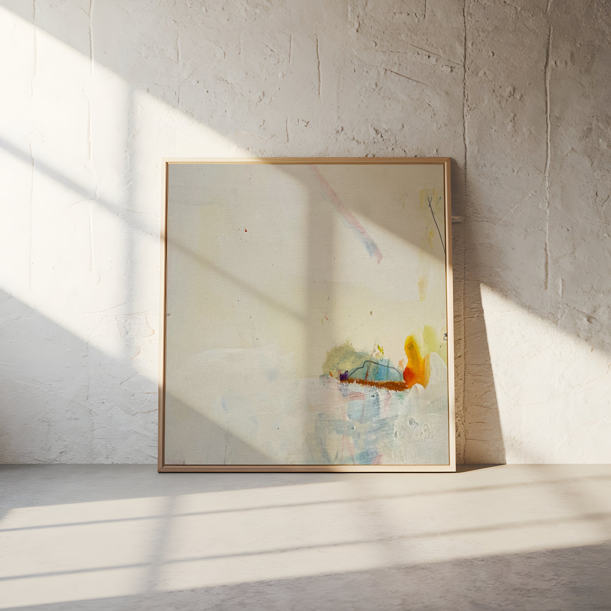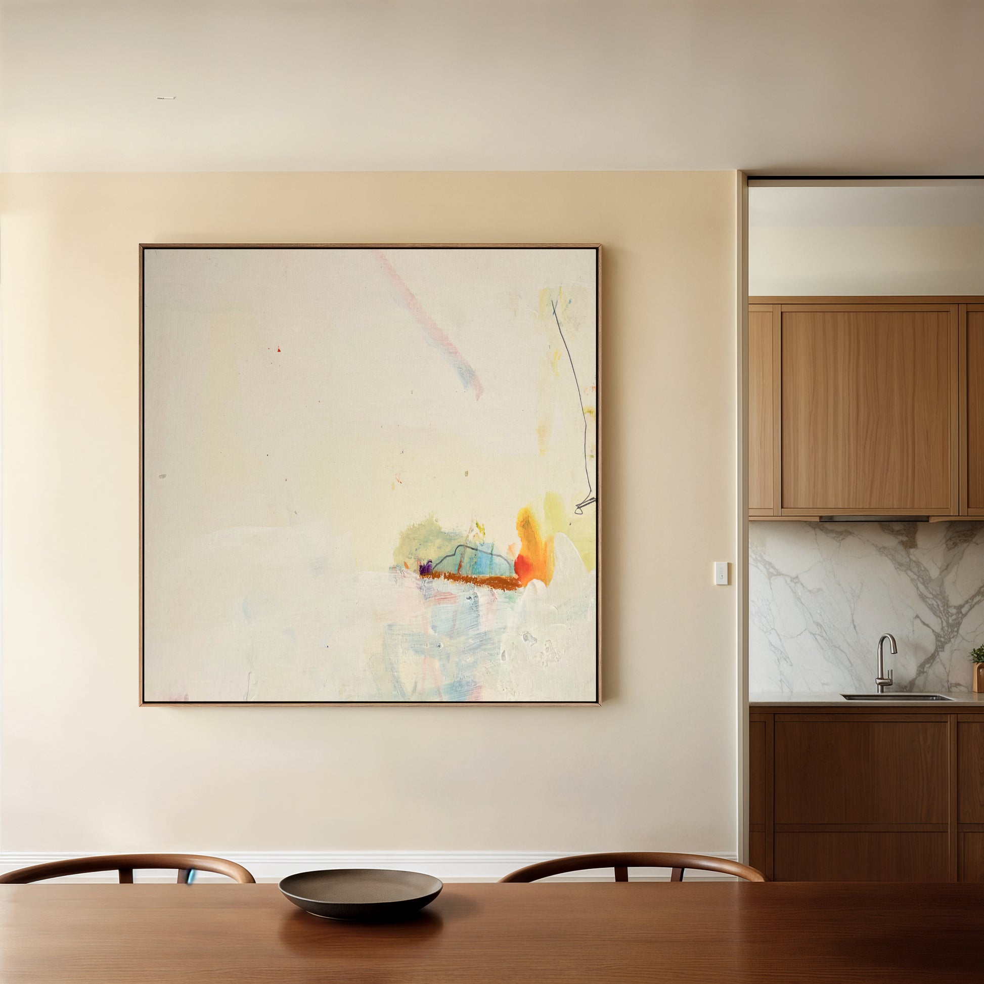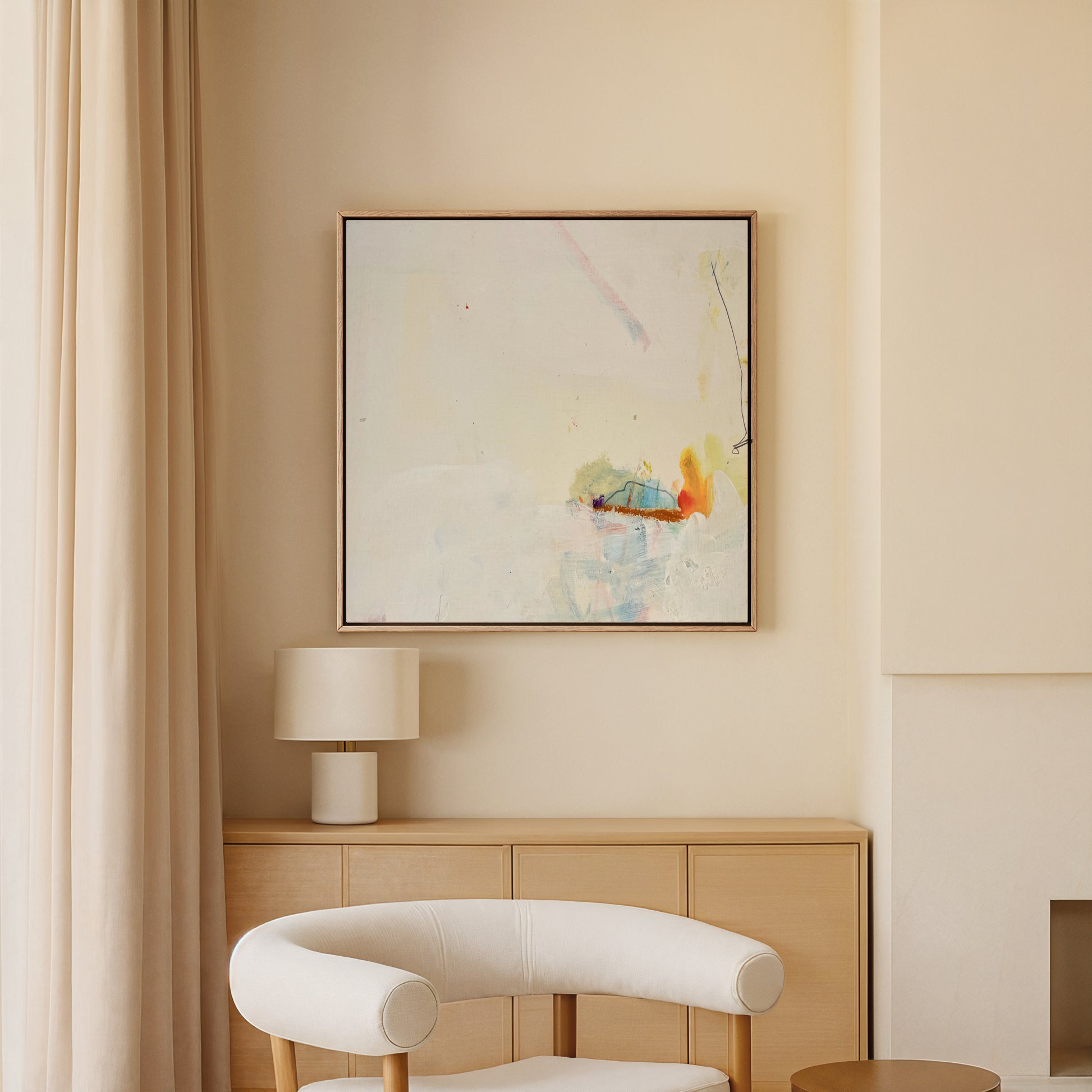 Line Between Breaths brings a sense of calm and openness to any space. Soft washes of color and subtle marks create a horizon that feels both grounded and weightless. The composition invites pause—an elegant balance between movement and stillness. It offers the room a feeling of quiet expansiveness, where simplicity holds depth and each line suggests the trace of something just remembered.