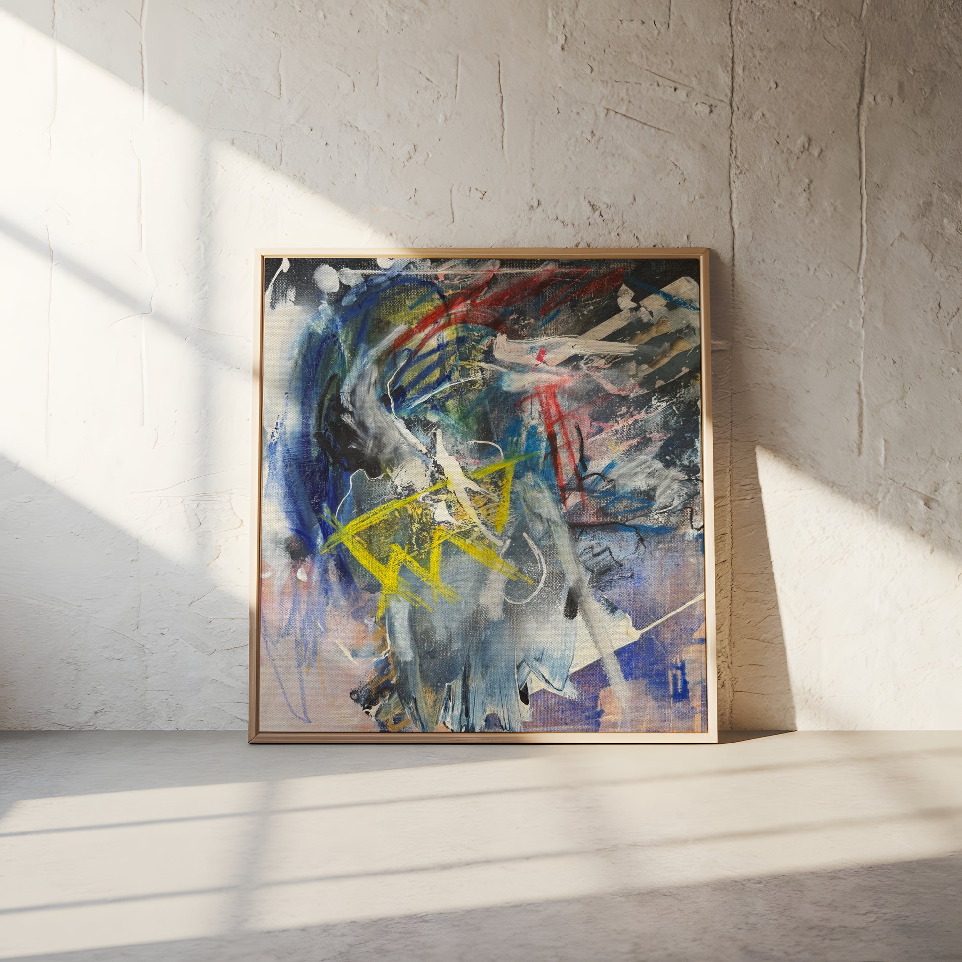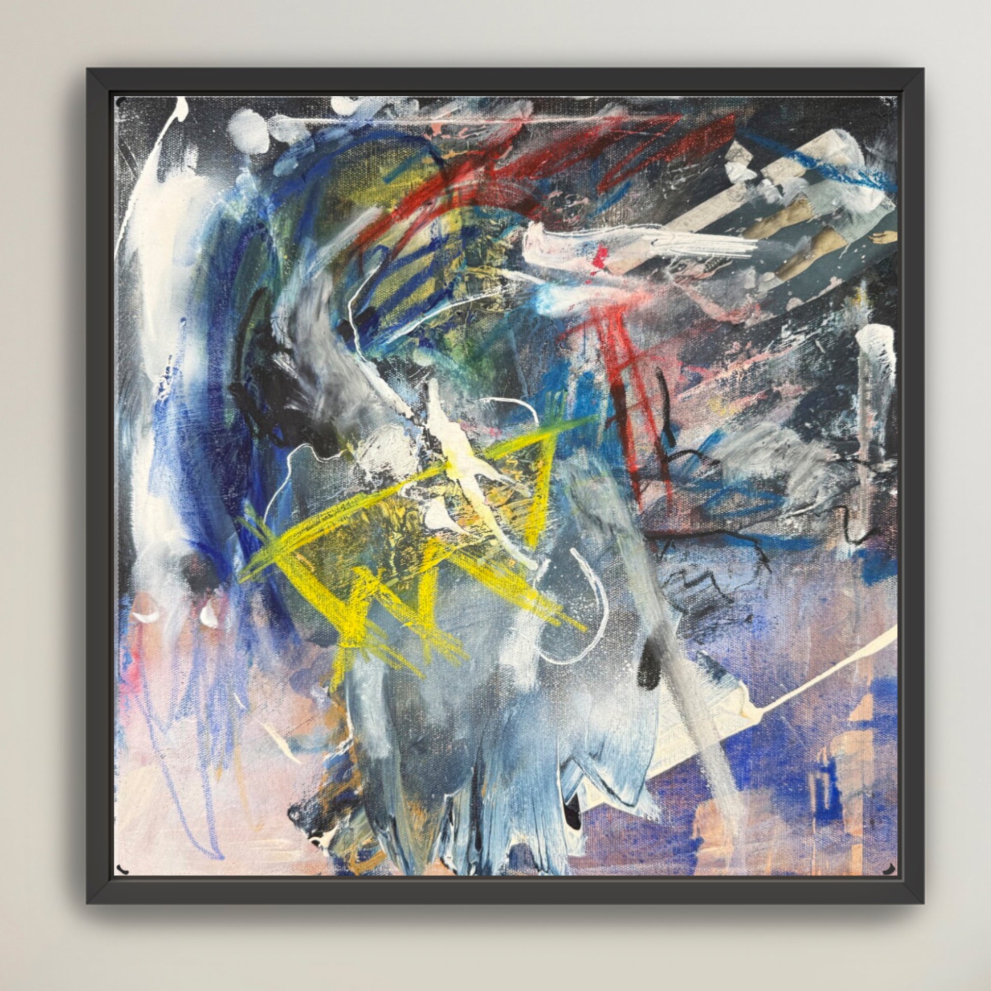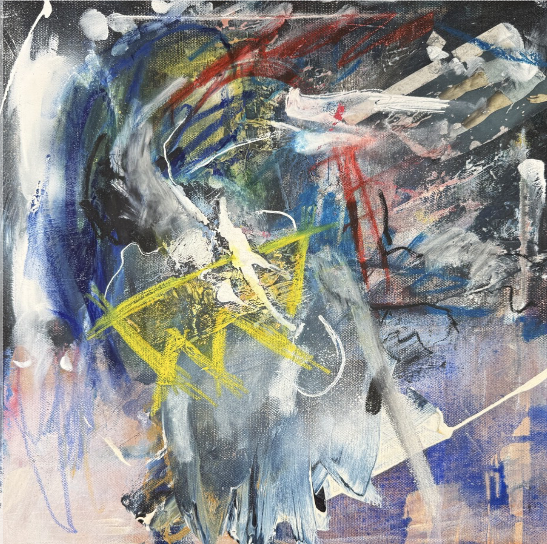 "Miles, Miles, Miles" is a response to Bon Iver’s Holocene, exploring distance, memory, and the feeling of being small in a vast world. The painting moves between control and release—layers of blue, white, and flashes of color suggest motion, fracture, and moments that blur together. It captures the tension between wanting to matter and letting go of that need. The title repeats like a quiet refrain, tracking the emotional miles more than the physical ones.