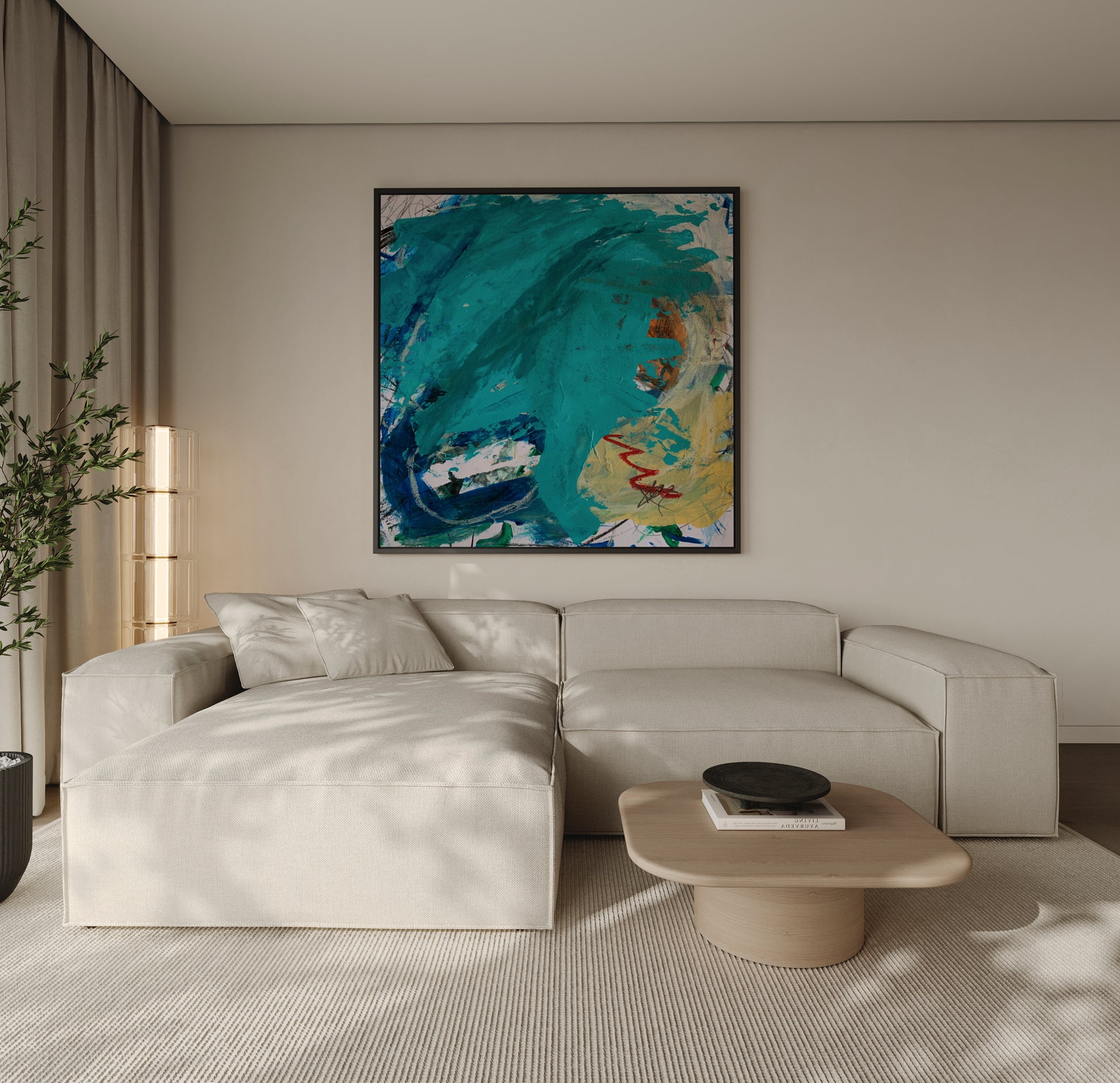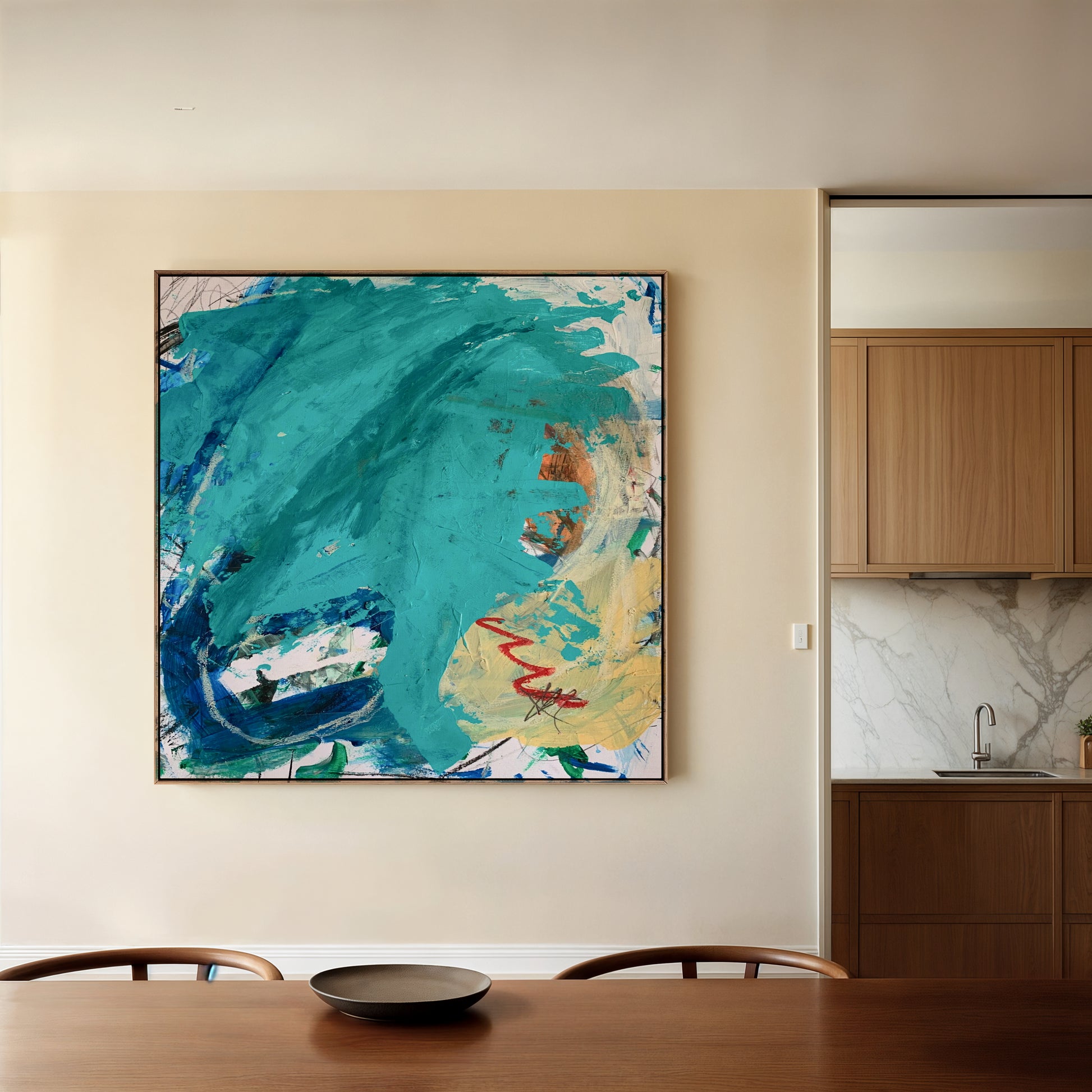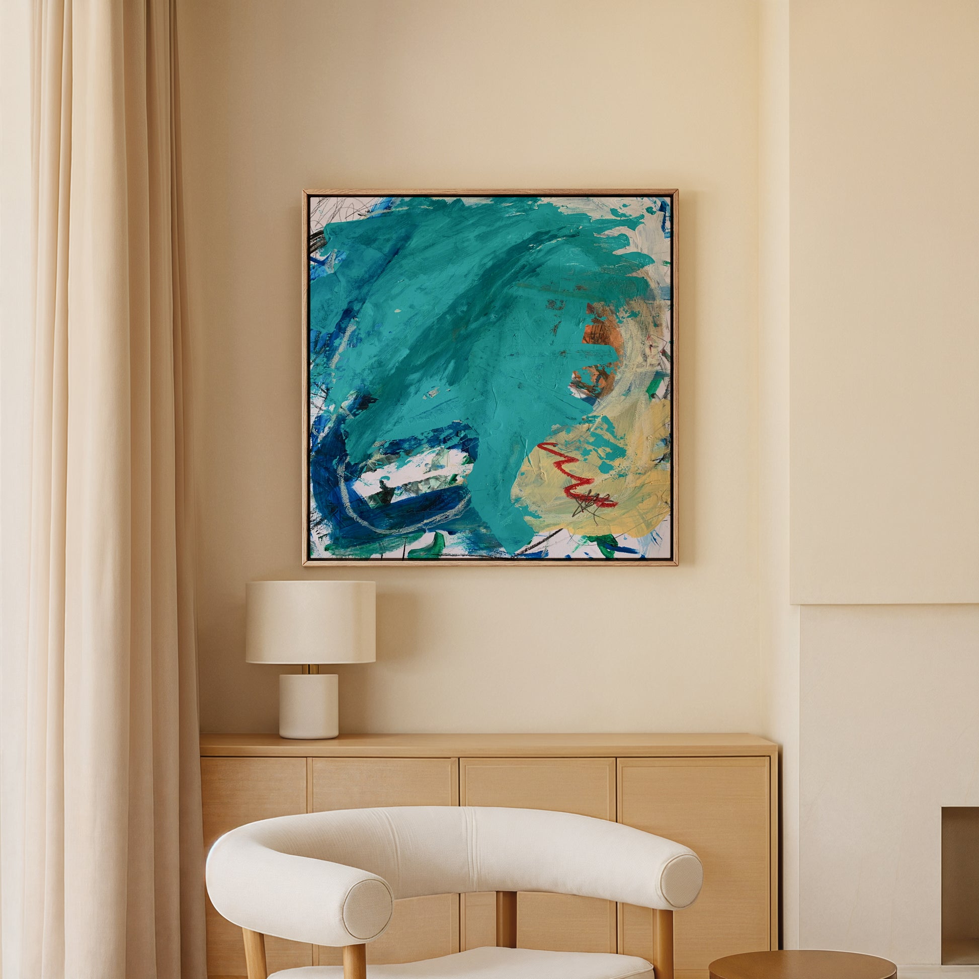 No. 19 energizes a space with movement and depth. Layers of turquoise, ochre, and crimson seem to surge and collide, evoking water, sky, and raw emotion. The piece carries a sense of momentum—alive yet balanced—infusing the room with creative charge and expressive freedom. It transforms the environment into one that feels vibrant, dynamic, and awake.