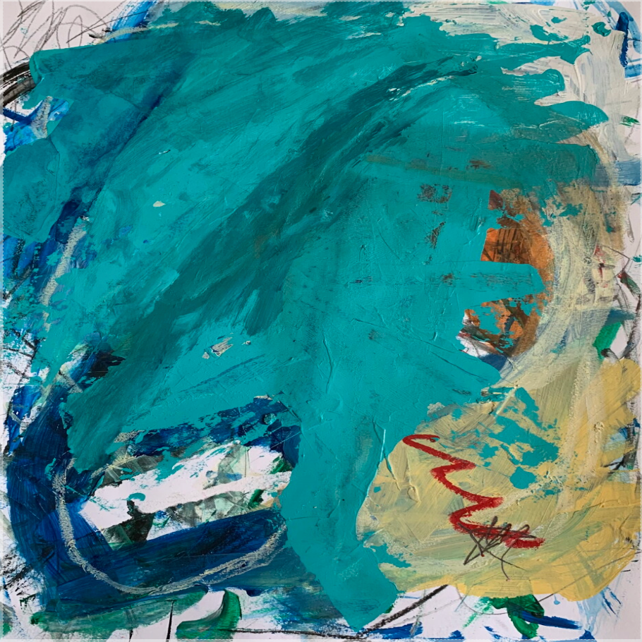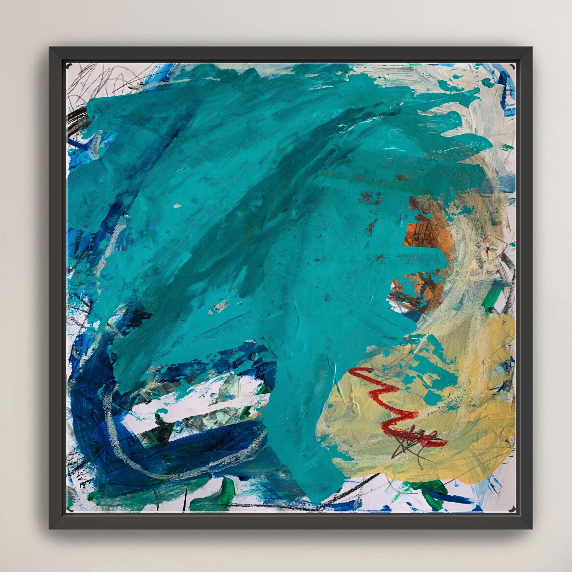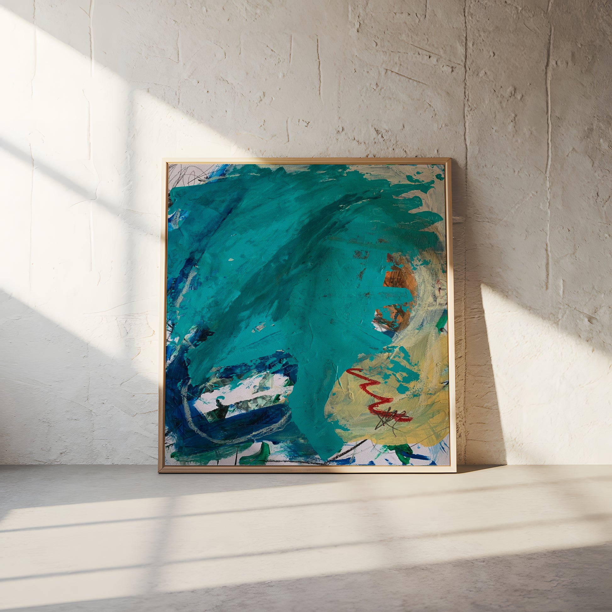 No. 19 energizes a space with movement and depth. Layers of turquoise, ochre, and crimson seem to surge and collide, evoking water, sky, and raw emotion. The piece carries a sense of momentum—alive yet balanced—infusing the room with creative charge and expressive freedom. It transforms the environment into one that feels vibrant, dynamic, and awake.