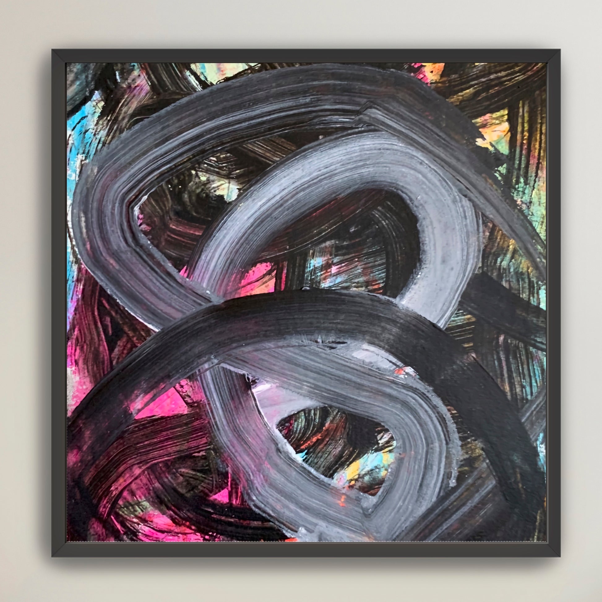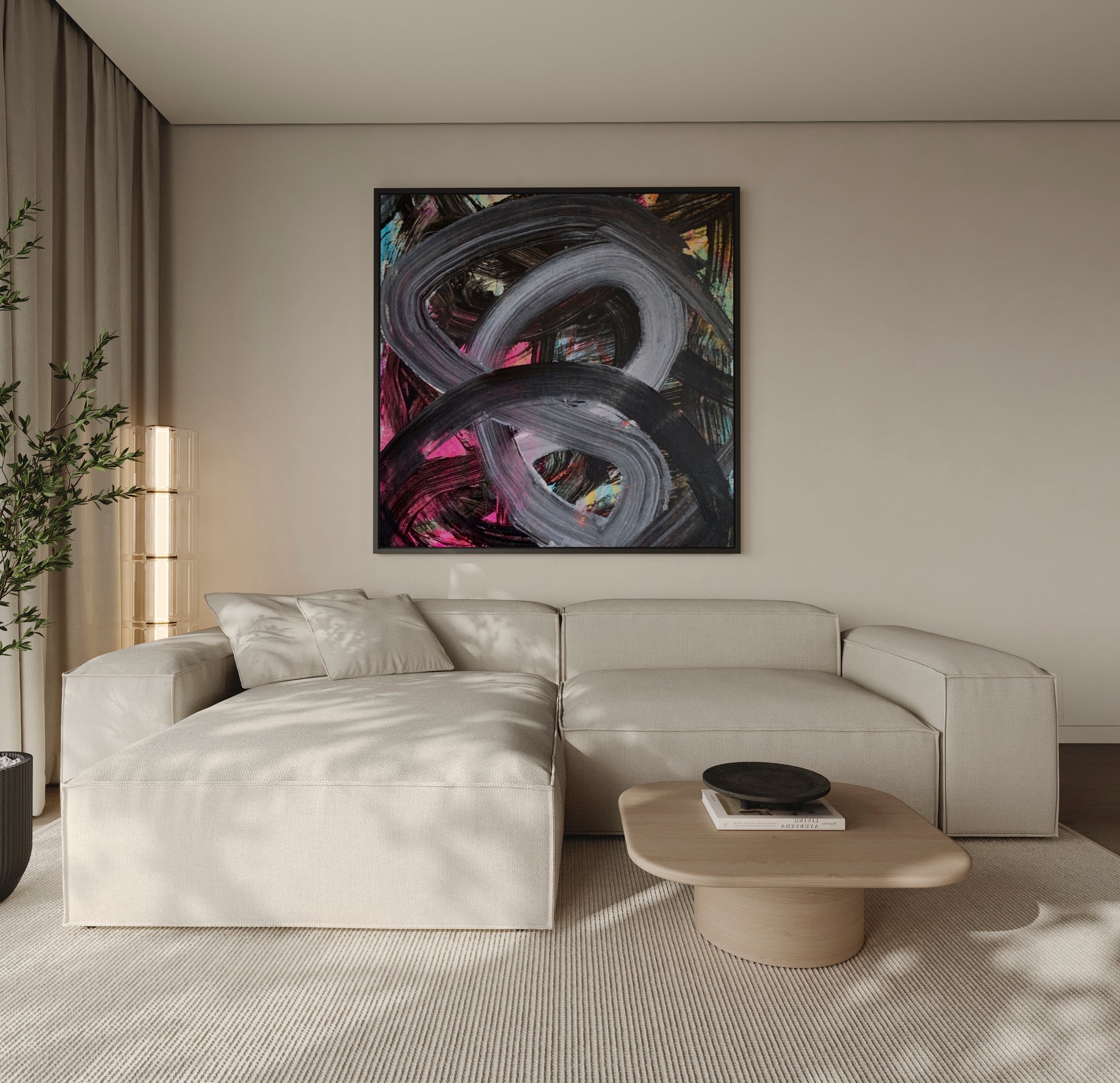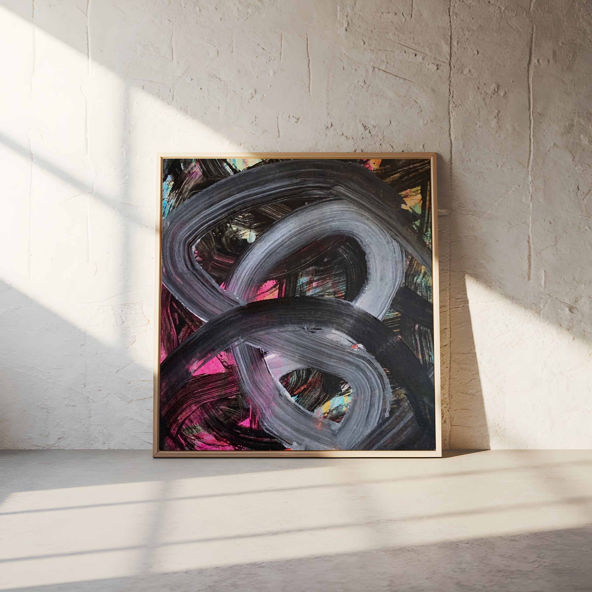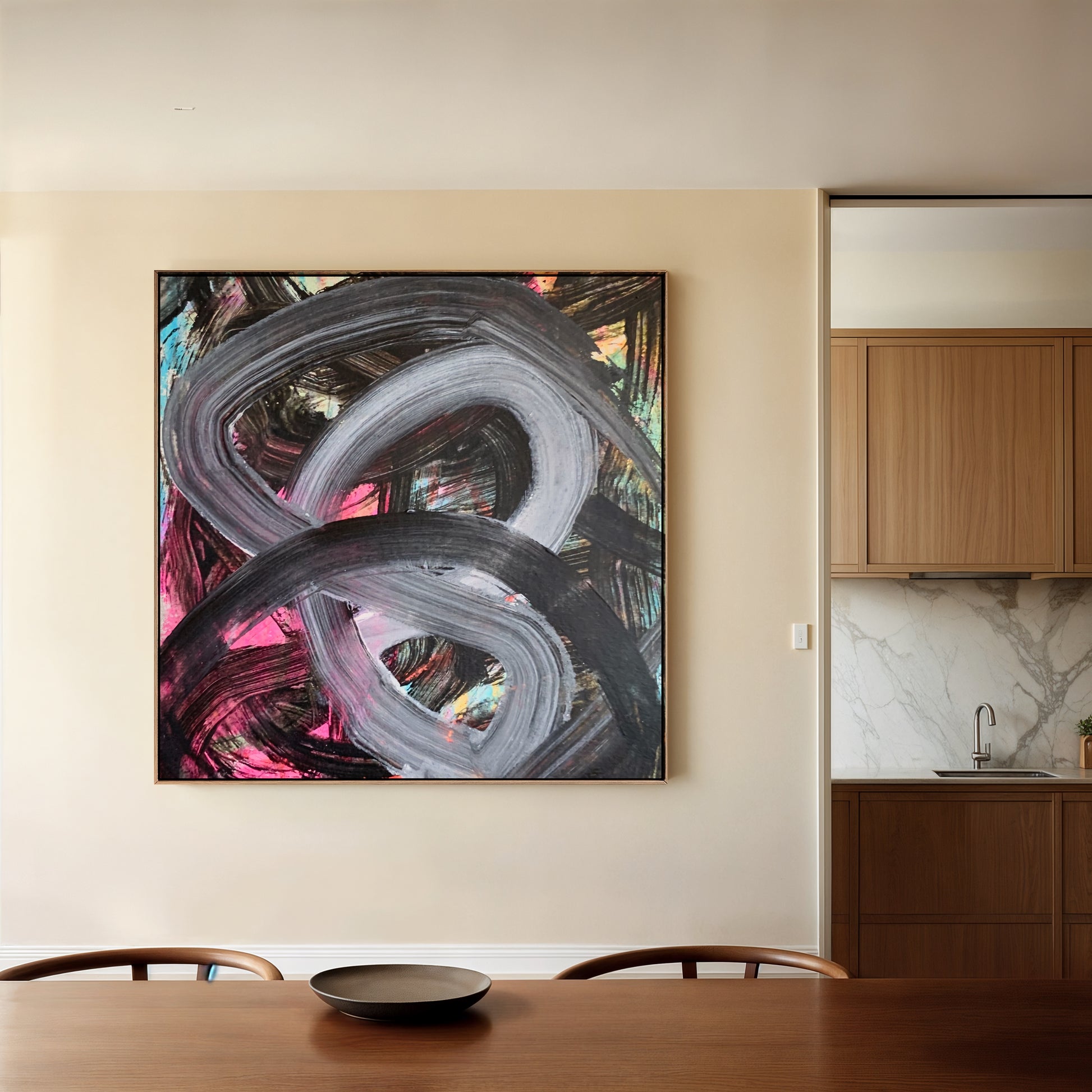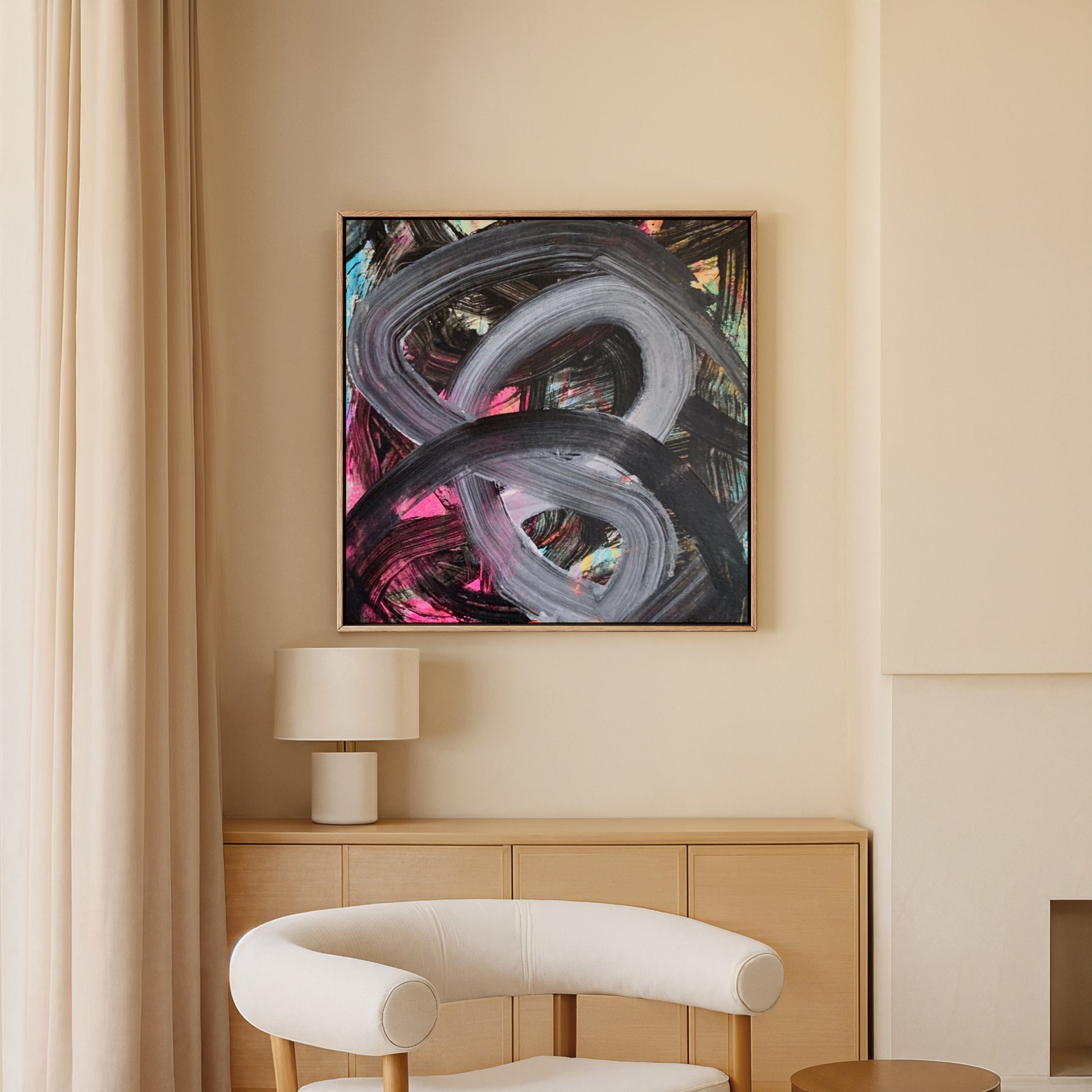 This piece brings a bold sense of movement and depth to any space. The sweeping grey and black gestures add grounding and sophistication, while flashes of pink, blue, and gold pulse with quiet energy. It invites reflection without demanding attention—perfect for a living room, entryway, or creative studio. Between What Was and What Might Be adds both calm and intrigue, transforming the atmosphere of a room into one of balance, presence, and quiet power.
