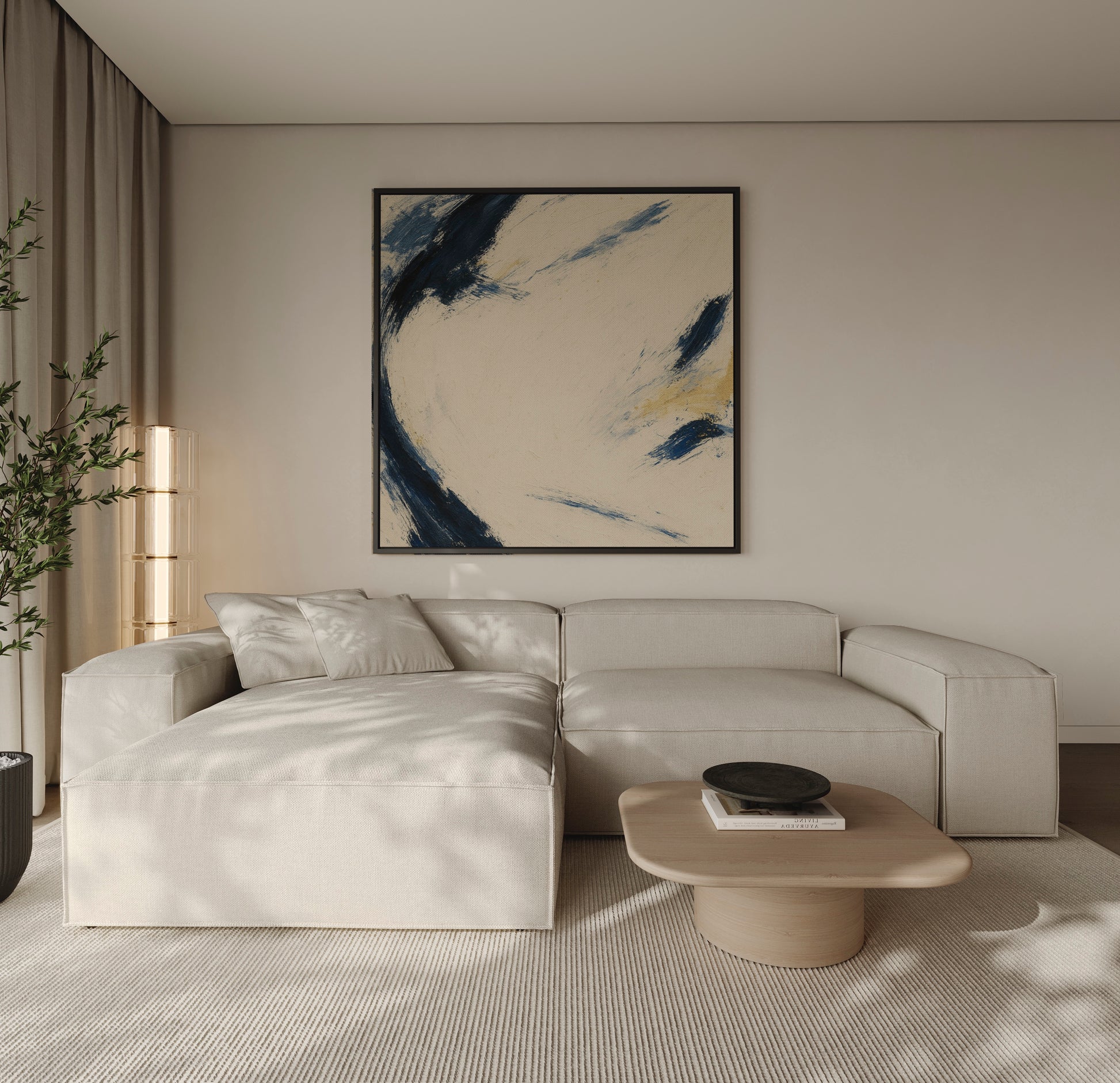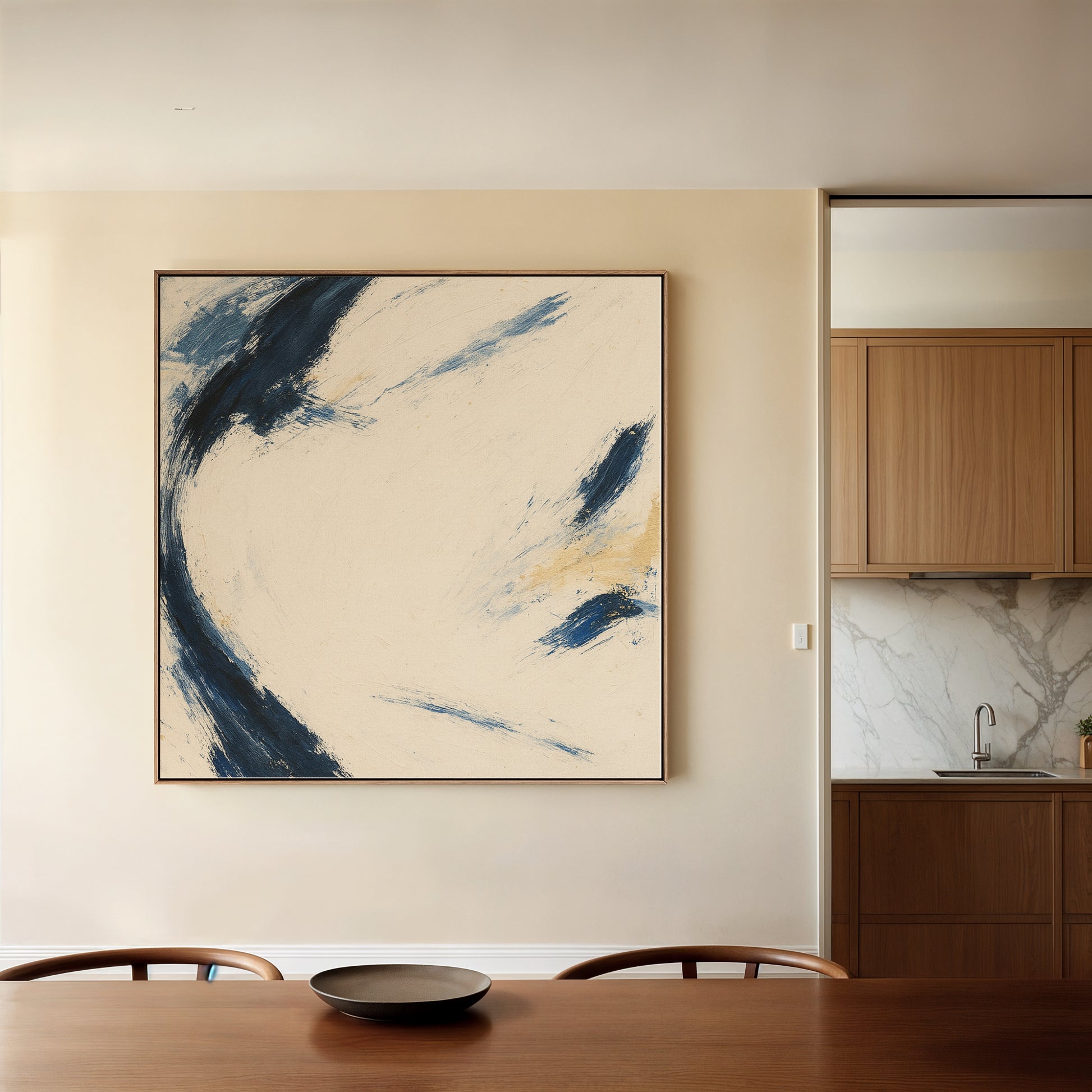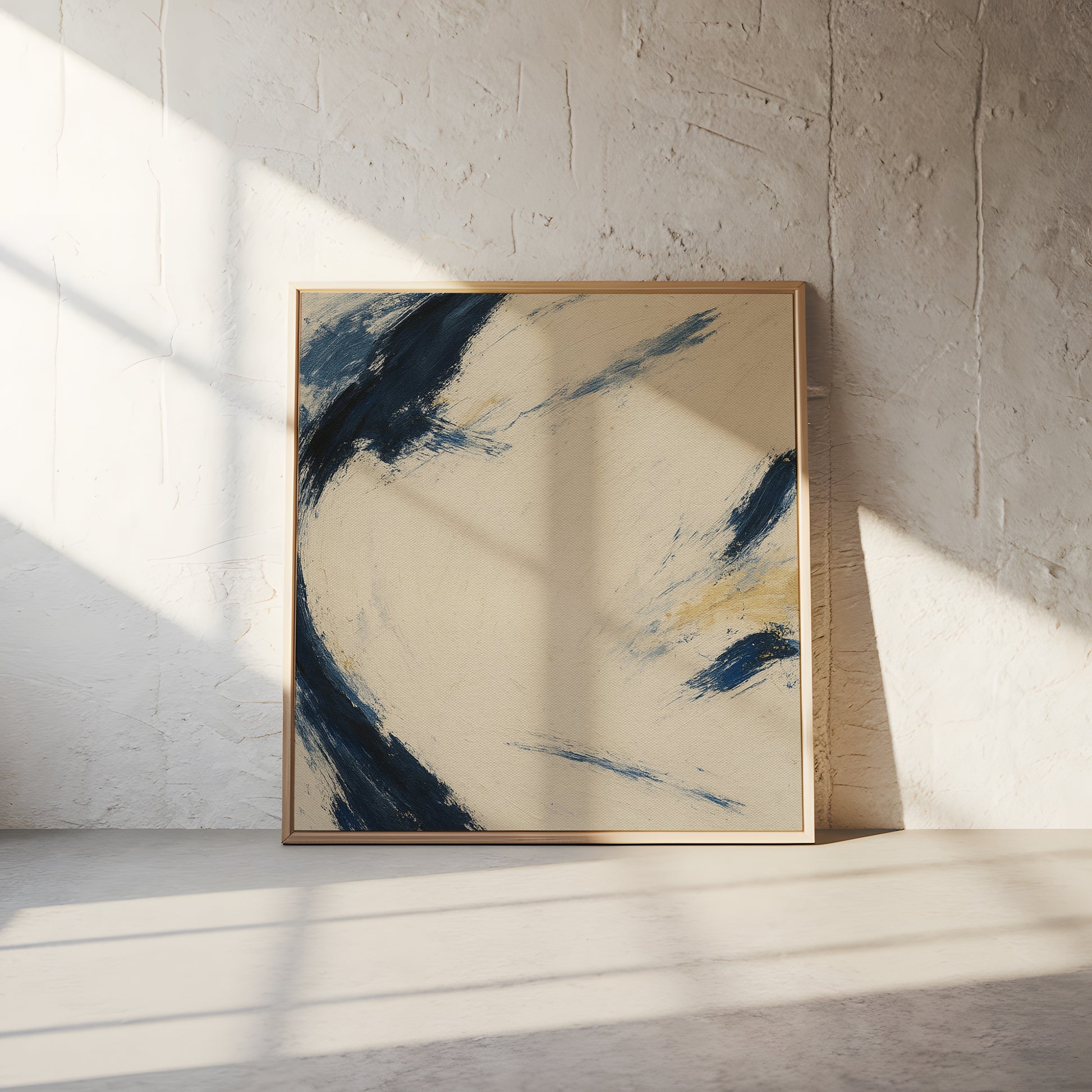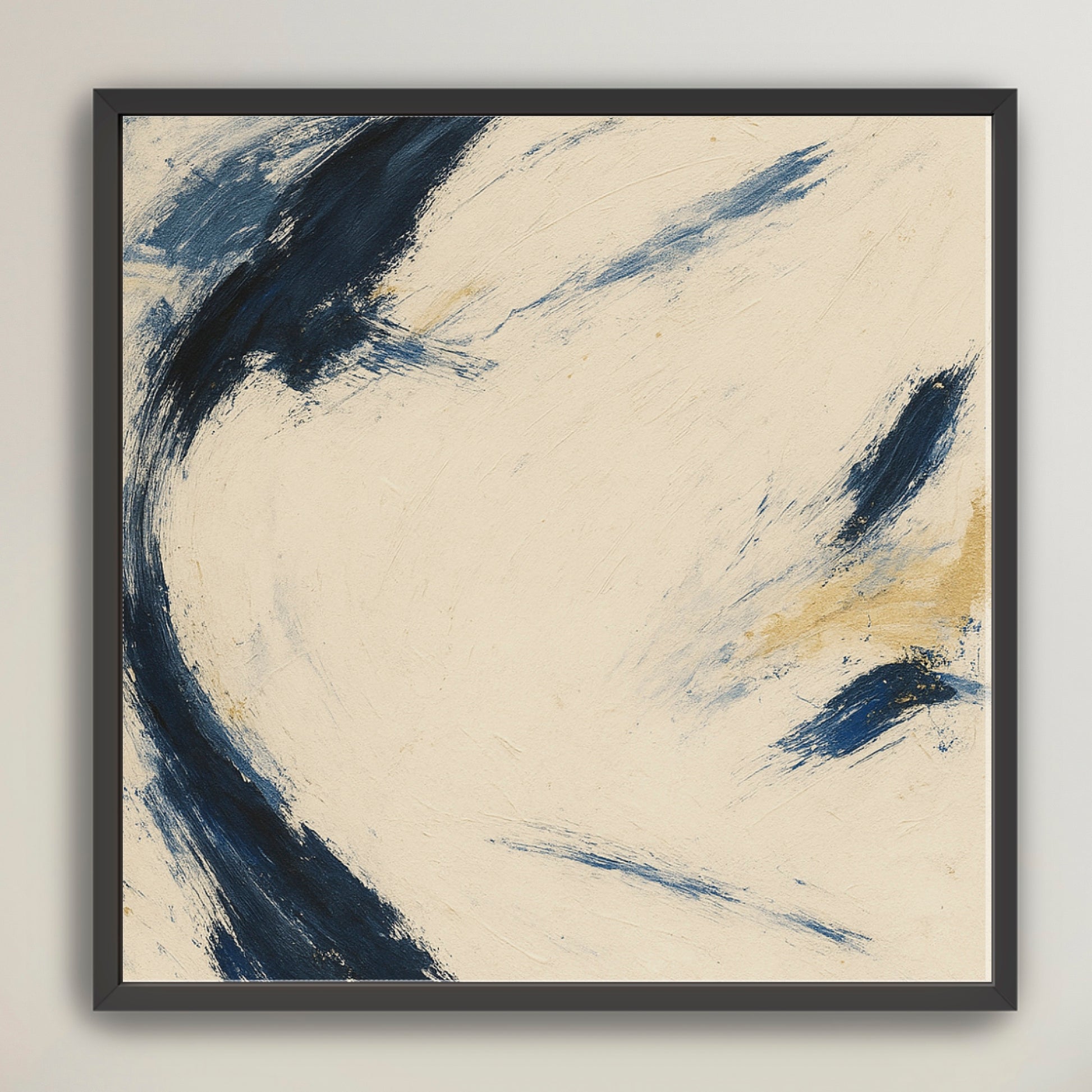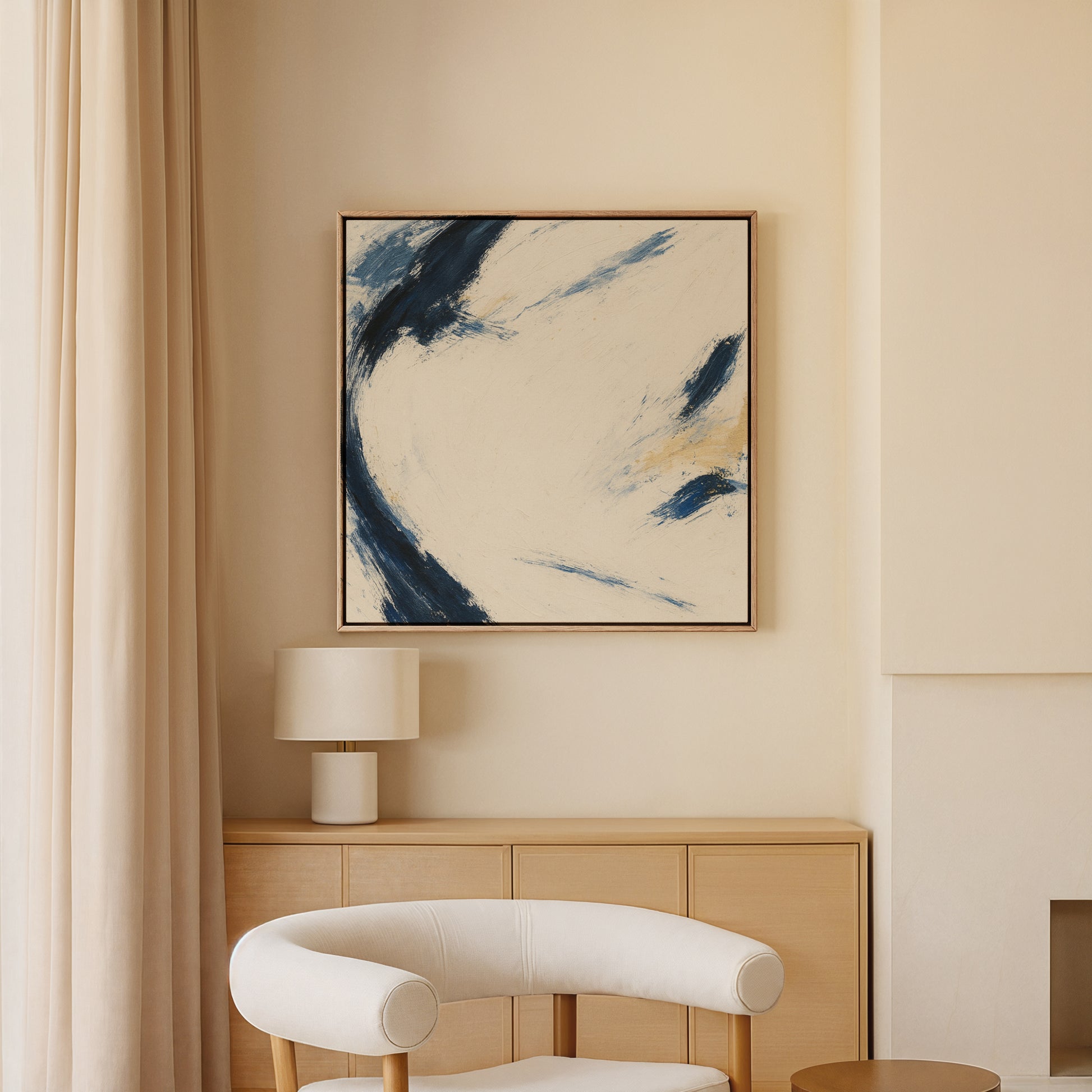 Elegant and fluid, Quiet Rush brings a feeling of open air and movement to any room. Soft ivory tones meet sweeping indigo strokes, creating a sense of wind, water, or a moment just before becoming. Its minimal palette and spacious composition make it ideal for serene, modern interiors—adding calm energy without overpowering the space. This piece invites stillness and flow in equal measure, making it perfect for a bedroom, hallway, or meditation area.