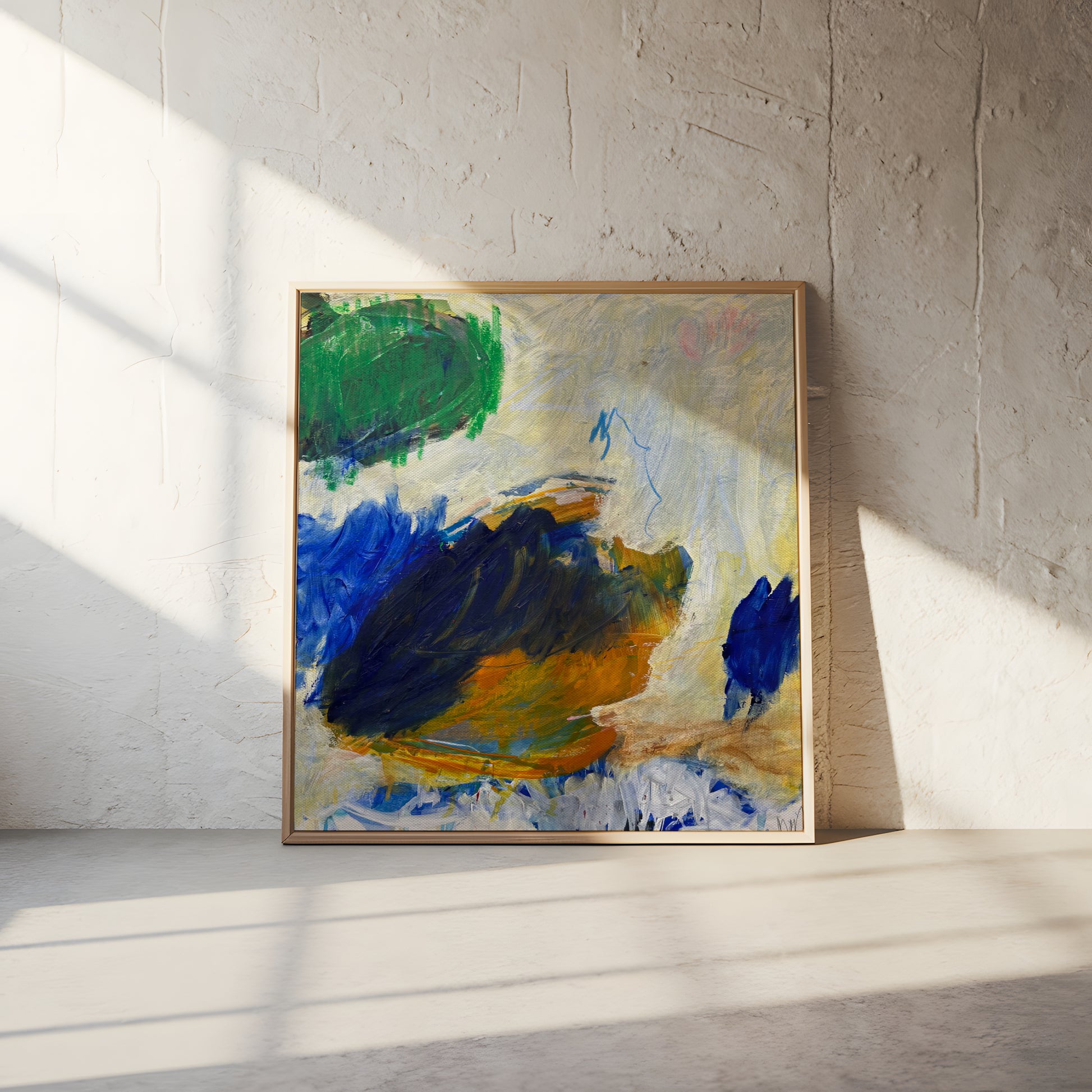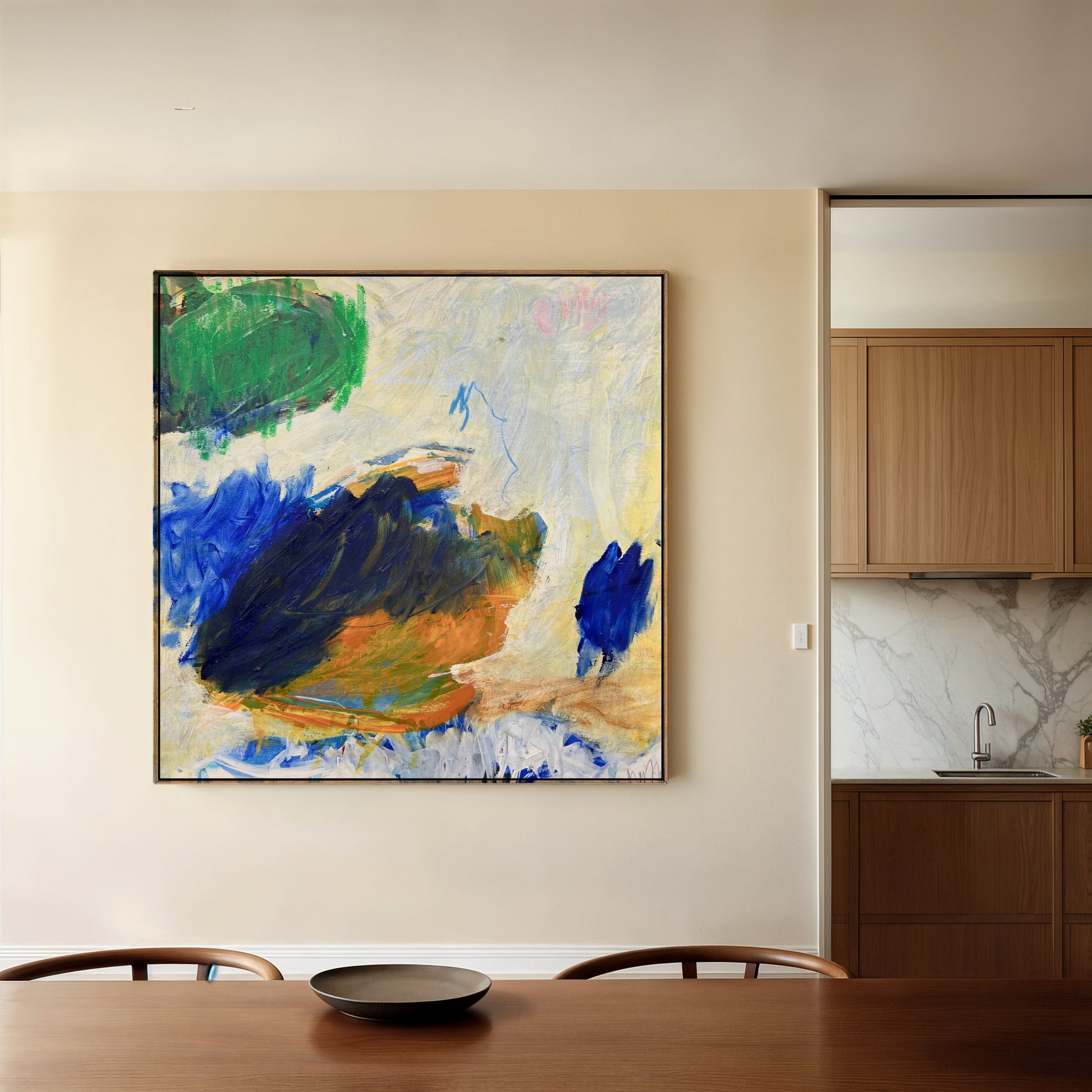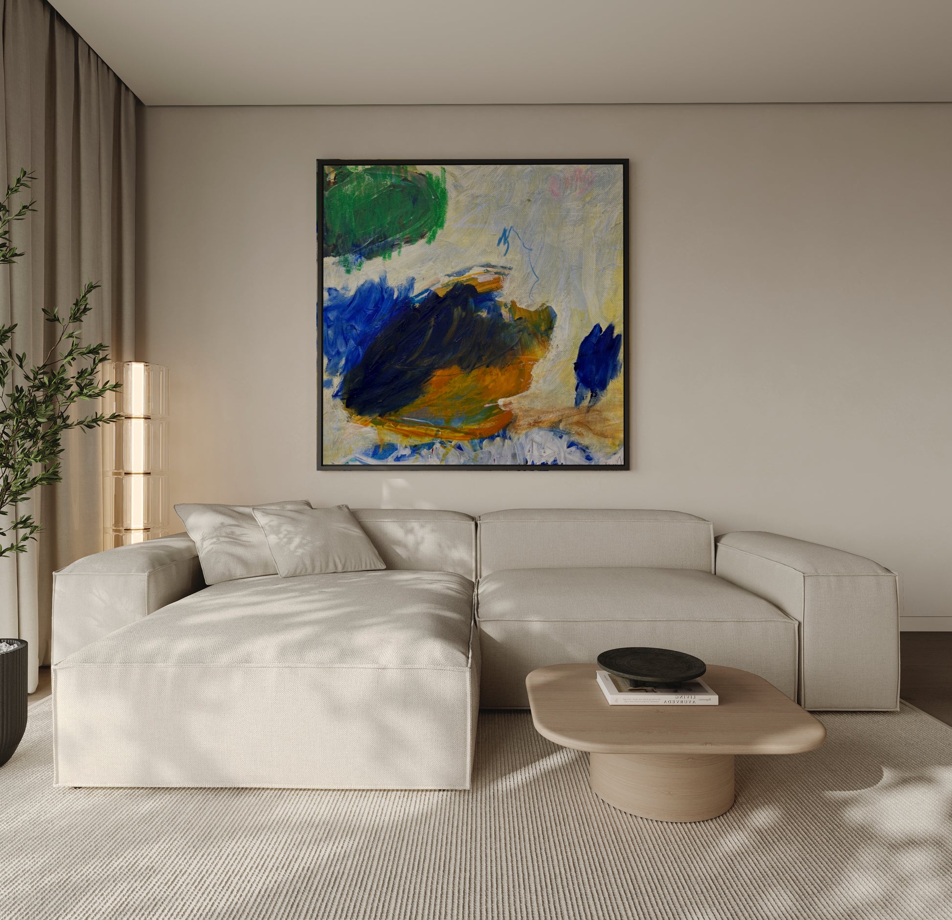 Solitude fills a space with quiet depth and grounded reflection. Broad gestures of blue and earthy ochre create a sense of landscape—vast, open, and inwardly still. The painting carries both weight and calm, offering the room a feeling of spaciousness and emotional resonance, like air after a storm or the pause before a new beginning.
