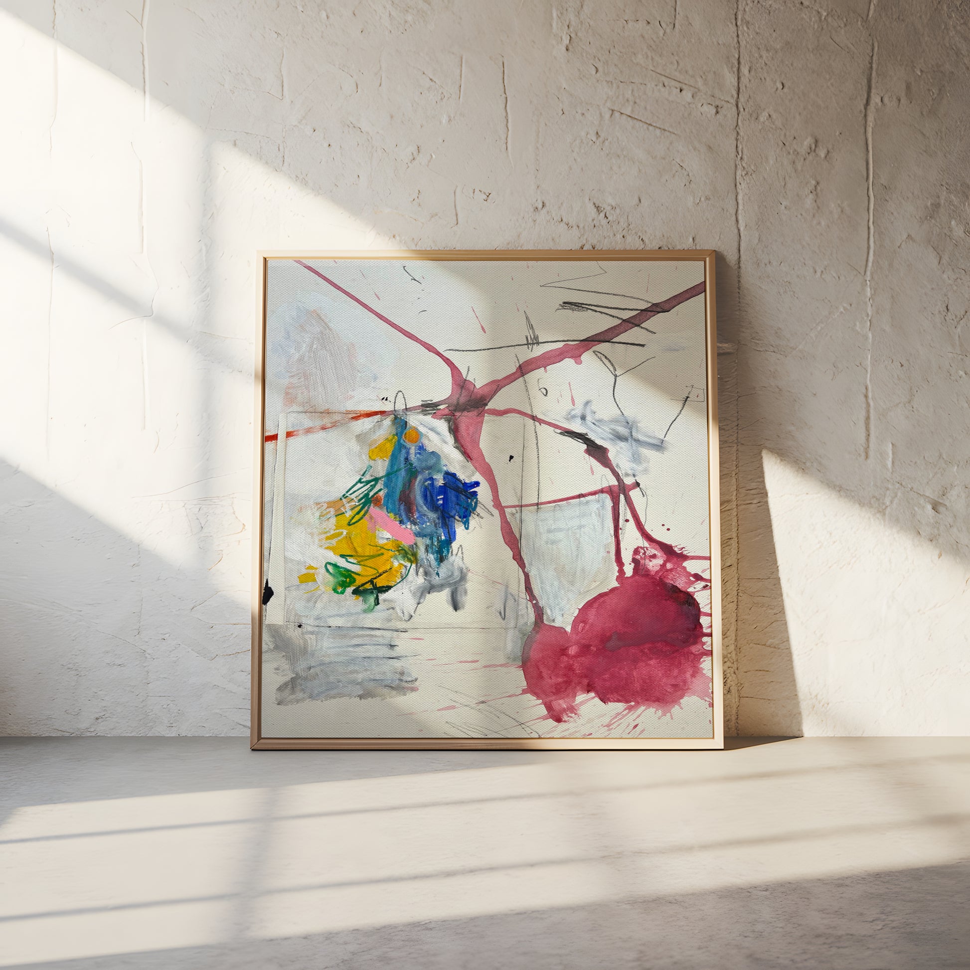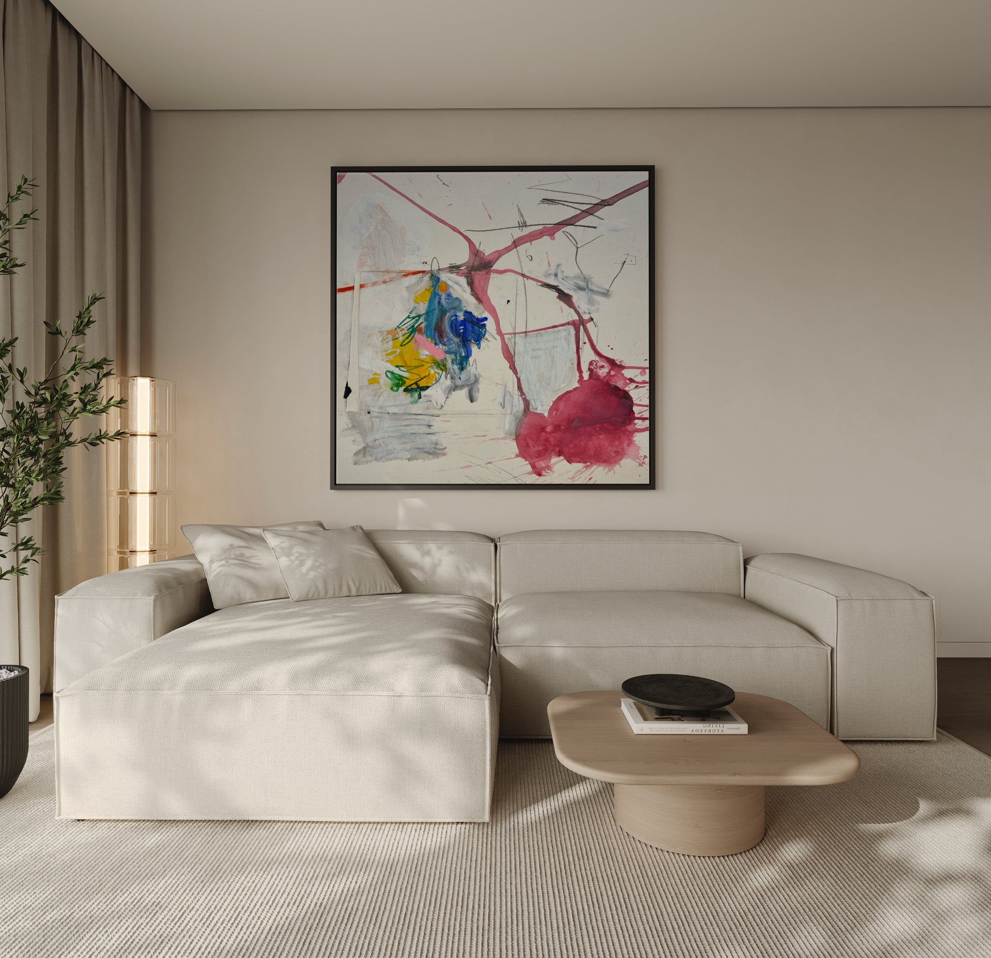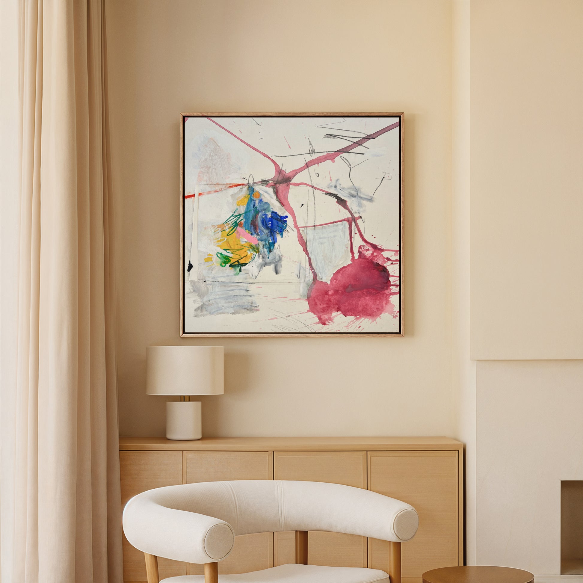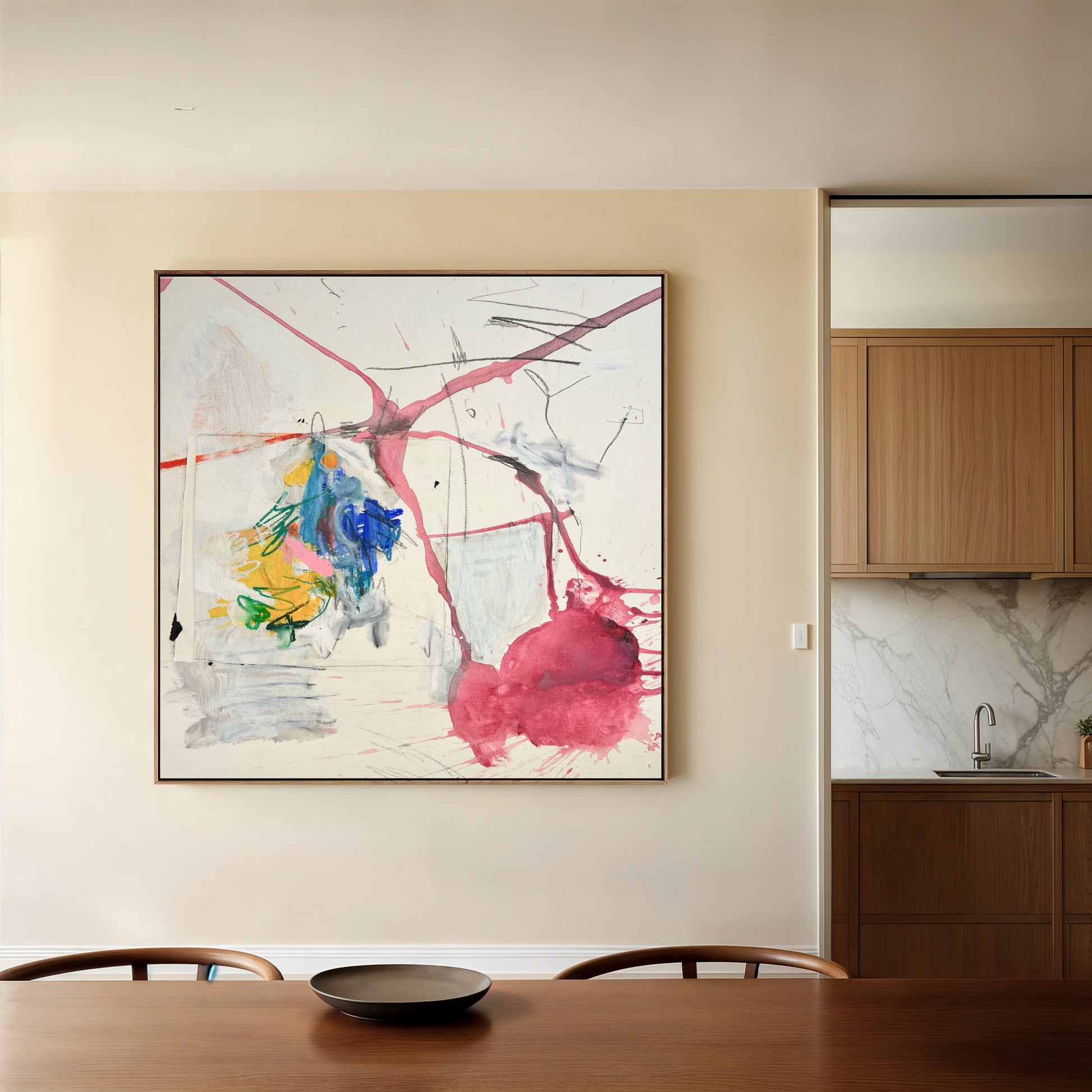 SpOt brings bold, expressive energy into a space. Vivid splashes of crimson and layered gestures of color create a sense of motion and discovery—like a moment of impact caught midair. The work adds vibrancy and edge to its surroundings, grounding spontaneity in balance. It makes a room feel alive, curious, and charged with creative possibility.